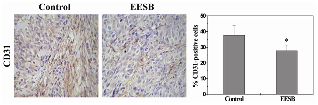 Angiogenesis plays an important role in the development and metastasis of cancers. Our former published data indicated that EESB suppresses proliferation, migration and tube formation of endothelial cells and downregulates the expression of VEGF-A, which suggest that EESB may be involved in the regulation of angiogenesis in vivo. We therefore hypothesized that EESB inhibits tumor growth probably via suppressing angiogenesis. To test this hypothesis, we examined the effect of EESB on the intratumoral microvessel density (MVD) using immunohistochemical (IHC) staining for the endothelial cell-specific marker CD31. As shown in Figure 2, the percentage of CD31-positive cells in control and EESB-treated mice was 37.75 ± 5.95% and 27.83 ± 3.60%, respectively (p < 0.05), demonstrating that EESB-caused inhibition of colon tumor growth is accompanied by its anti-angiogenic activity.