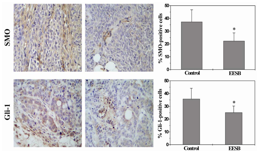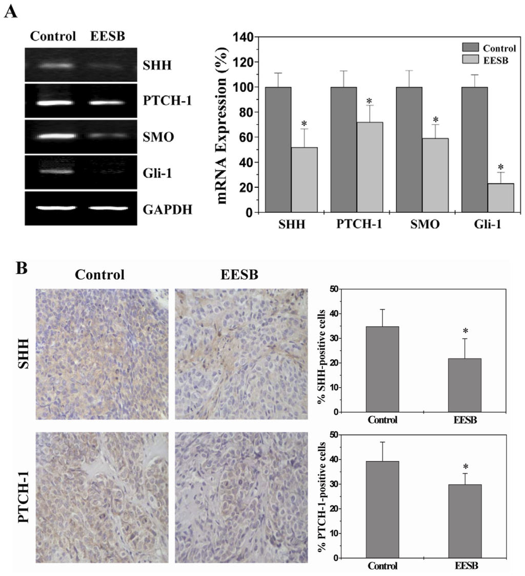 Tumor angiogenesis is tightly regulated by Sonic Hedgehog (SHH) pathway, we therefore assessed the effect of EESB on the expression of key mediators of SHH pathway using IHC and RT-PCR analyses. As shown in Figure 3A, EESB treatment profoundly reduced the mRNA expression of SHH, PTCH-1, SMO and Gli-1 in tumor tissues. Consistently, their protein expression was also significantly inhibited by EESB treatment. The percentage of SHH-, PTCH-1-, SMO- or Gli-1-positive cells in control group was 34.83 ± 6.91%, 39.33 ± 7.74%, 37.33 ± 9.40% or 35.83 ± 8.30%, whereas that in EESB-treated mice was 21.83 ± 8.04%, 29.83 ± 4.49%, 22.33 ± 6.31% or 25.17 ± 5.12% (Figure 3B). Collectively, these data suggest that the in vivo inhibitory effect of EESB on tumor angiogenesis could be mediated by the suppression of SHH signaling pathway.