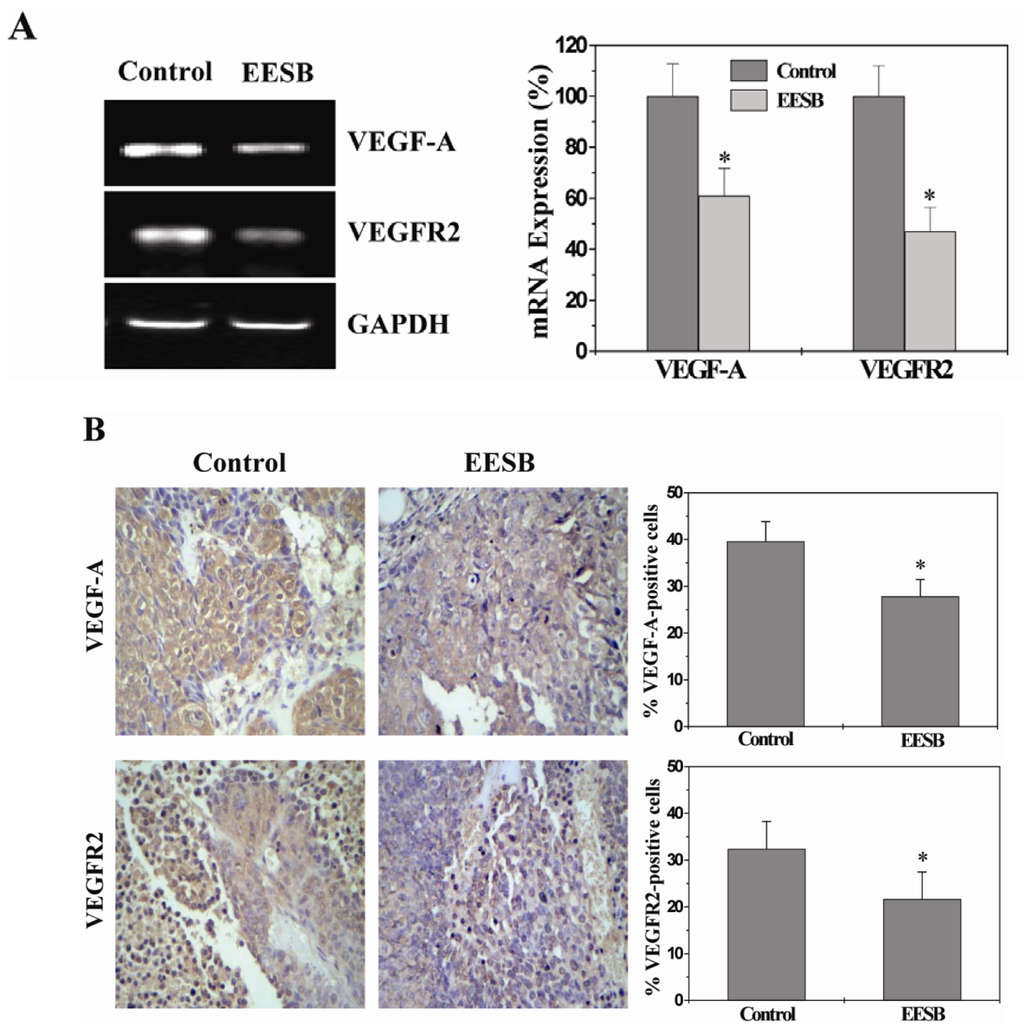 Effect of EESB on the expression of VEGF-A and VEGFR2 in CRC xenograft mice. (A) The mRNA expression levels of Vascular endothelial growth factor-A (VEGF-A) and VEGF Receptor 2 (VEGFR2) were determined by RT-PCR. GAPDH was used as the internal control. The data of densitometric analysis were normalized to the mean mRNA expression of untreated control (100%); (B) Tumor tissues were processed for IHC staining for VEGF-A and VEGFR2. The photographs were representative images taken at a magnification of ×400. Quantification of IHC assay was represented as percentage of positively-stained cells. Data shown were averages with S.D. (error bars) from 10 individual mice in each group. * p < 0.05, versus controls.