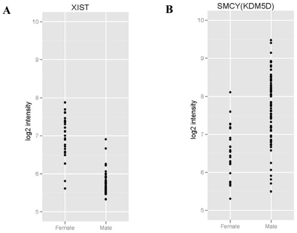 (A) Evidence of female-specific gene expression preservation in dried blood spots (DBS) by dot plot analysis of XIST. XIST gene probe intensities showed differentiation and preservation of its RNA gene expression in males vs. females; (B) Evidence of male-specific gene expression preservation in DBS by dot plot analysis of KDM5D. KDM5D gene probe intensities showed differentiation and preservation of its RNA gene expression in males vs. females.