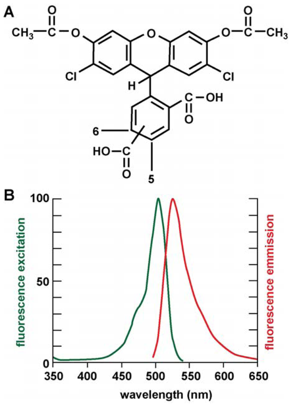 (A) Molecular structure of the mixed isomer, cell permeant 5-(and-6)-carboxy-2′,7′-dichlorofluorescein diacetate [carboxy-DCFDA; C25H14Cl2O9; MW 529.3; Molecular Probes C-369; CAS name = 3′,6′-bis(acetyloxy)-2′,7′-dichloro-3-oxo-spiro-[iso-benzofuran-1(3H),9′-(9H)xanthene-ar-carboxylic acid; CAS number 127770-45-0]; the twin CH3COO-R-groups facilitate cellular entry; intracellular esterases cleave these to “trap” the molecule within the cell; (B) peak excitation (λEx 502 nm; shown in green) and peak emission (λEm 530 nm; shown in red) for 5-(and-6)-carboxy-2′,7′-dichlorofluorescein diacetate after removal of acetyl groups by cellular esterases; the dicarboxyl groups at positions 5 and 6 appear to stabilize the carboxy-DCFDA flurophor to prolong intracellular fluorescence yield.