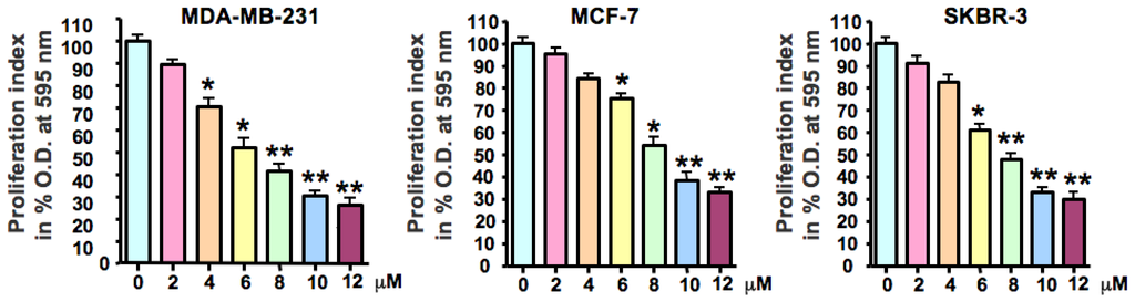 First, we tested the growth inhibitory effects of As2O3 using the MTT assay in three human breast cancer cell lines, MDA-MB-231, MCF-7, and SKBR-3. As expected, treatment of breast cancer cells for 72 h with 2, 4, 6, 8, 10, and 12 μM of As2O3 led to cell growth inhibition in a dose-dependent manner in all three breast cancer cell lines (Figure 1). The IC50 that caused 50% inhibition of cell growth for three breast cancer cell lines was found around 8 μM.