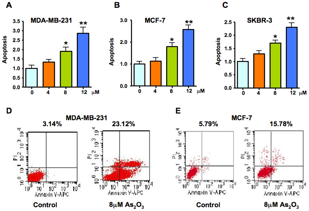 Effect of As2O3 on breast cancer cell apoptosis. Cell death assay for measuring apoptosis induced by As2O3 was done in MDA MB-231 (A), MCF-7 (B) and SKBR-3 (C) cells treated with different doses of As2O3 for 72 h. Apoptosis was measured by Histone-DNA ELISA method. Values are reported as mean ± SD. * p < 0.05, ** p < 0.01, compared to the control. (D, E) MDA MB-231 and MCF-7 cells were treated with 8 μM As2O3 for 72 h. Annexin V/PI staining was performed to detect the apoptosis.