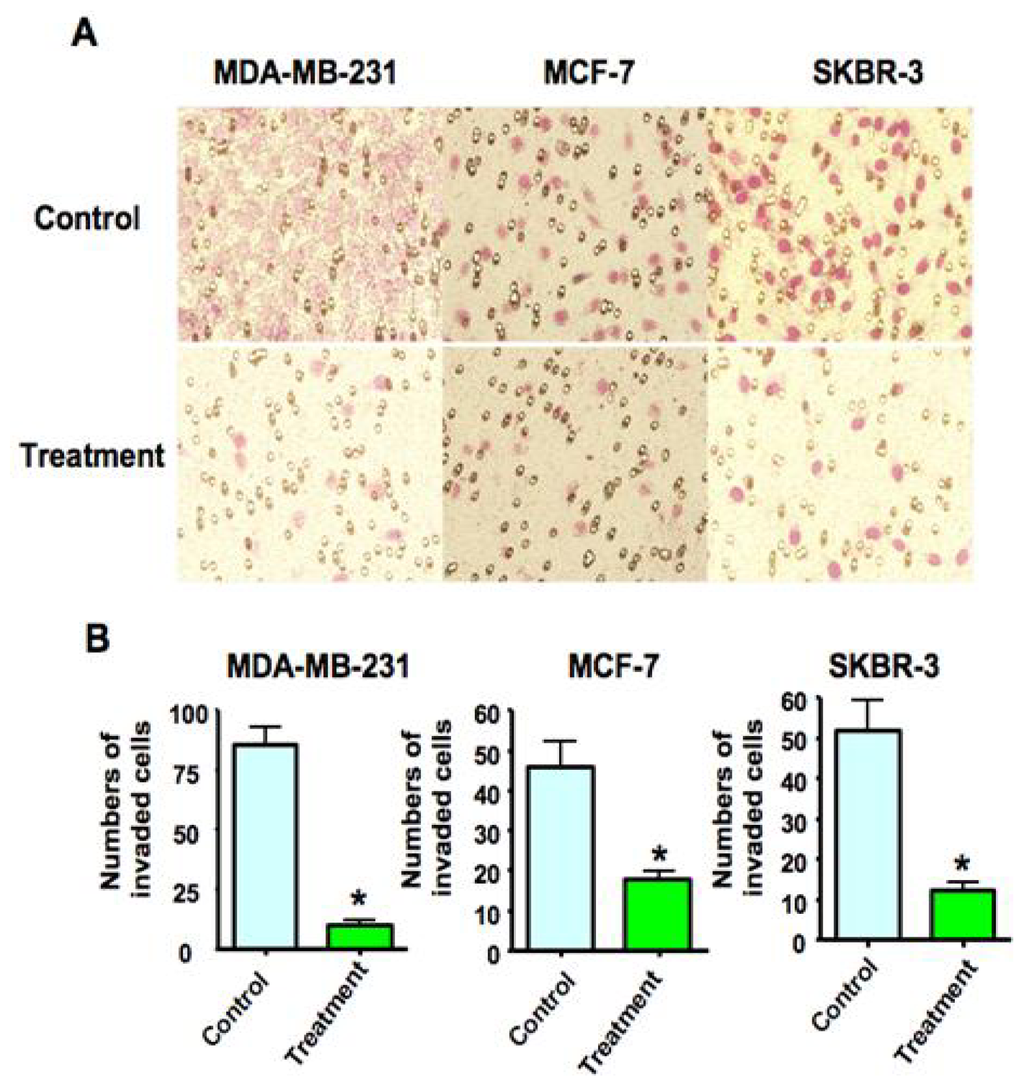 Consistent with the anti-invasive role of As2O3, we found that 8 μM As2O3 resulted in decreased penetration of breast cancer cells through the matrigel-coated membrane compared with the control cells. Further quantitation of the numbers of invaded breast cancer cells was significantly decreased after As2O3 treatment compared to control cells (Figure 3). It is important to note that 8 μM As2O3 did not inhibit the cell growth at 24 h (data not shown), suggesting that the decrease in cell invasion is not due to a drop in cell numbers.