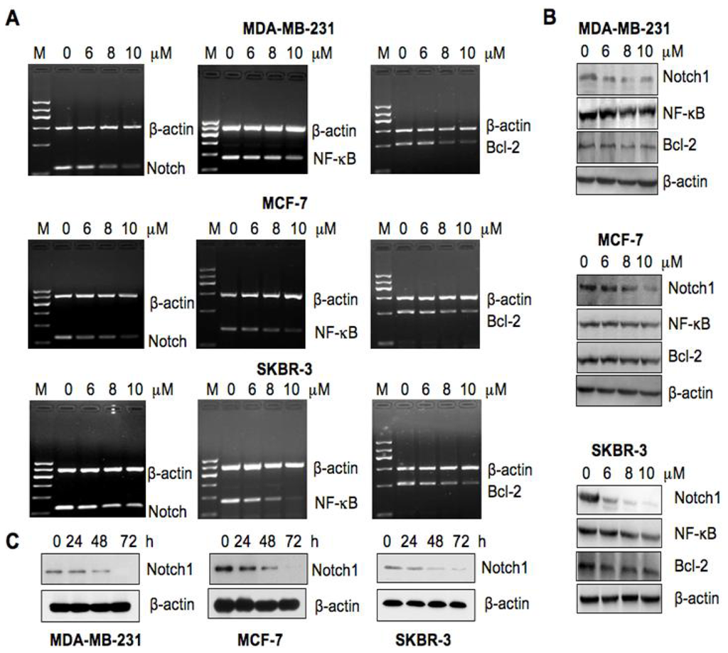 Next, we investigated whether As2O3 treatment could cause down-regulation of Notch-1 downstream genes. It has been well characterized that NF-κB and Bcl-2 are two key downstream targets of Notch-1 [22,23]. Therefore, we assessed the expression of NF-κB and Bcl-2 at both mRNA and protein levels. Our results showed that As2O3 suppressed the expression of NF-κB and Bcl-2 both at the mRNA and protein levels in three breast cancer cells (Figure 4).