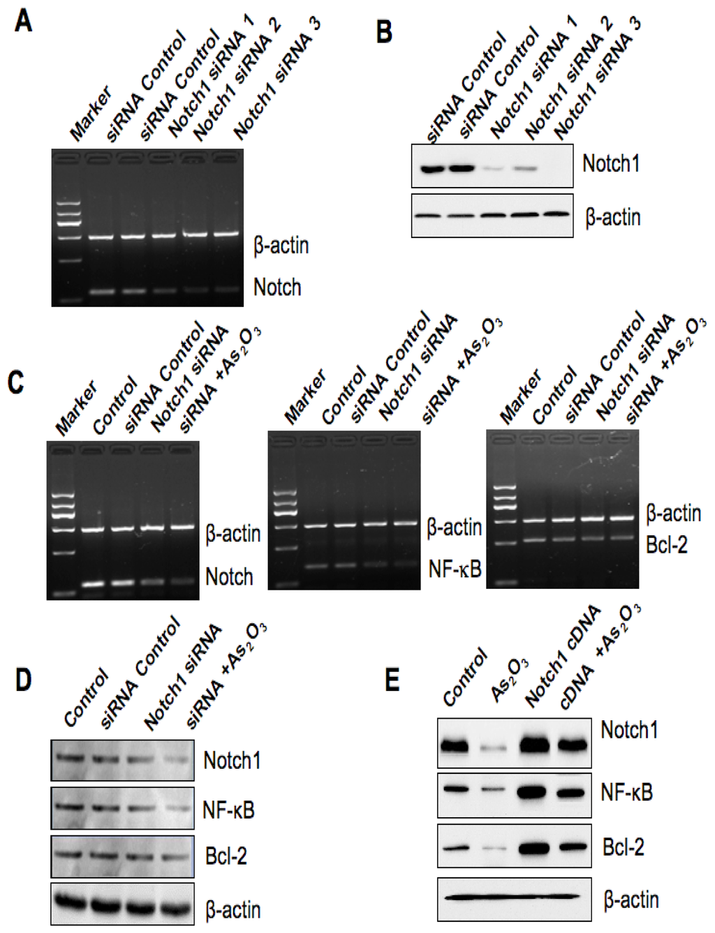 The total RNA from As2O3-treated cells was isolated by Trizol (Invitrogen, Carlsbad, CA) and purified by RNeasy Mini Kit and RNase-free DNase Set (QIAGEN, Valencia, CA) according to the manufacturer’s protocols. One microgram of total RNA from each sample was subjected to first strand cDNA synthesis using TaqMan reverse transcription reagents kit (Applied Biosystems, Foster City, CA). RT reaction was performed at 25 °C for 10 min, followed by 48 °C for 30 min and 95 °C for 5 min. PCR reaction was performed at 94 °C for 30 s, followed by 48 °C for 30 s and 72 °C for 40 s. The primers used in the PCR reaction were as follows: NOTCH-1: 5′-CGA CGT CAA CGC CGT AGA T-3′ and 5′-CTC CTC CCT GTT GTT CTG CAT AT-3′; NF-κB: 5′-AGG ACA TAT GAG ACC TTC AAG AGC-3′ and 5′-CTC ATC ATA GTT GAT GGT GCT CAG-3′; Bcl-2: 5′-GGC GCA CGC TGG GAG AAC-3′ and 5′-TAG CGG CGG GAG AAG TCG TC-3′. GAPDH: 5′-CAA GGT CAT CCA TGA CAA CTT TG-3′ and 5′-GTC CAC CAC CCT GTT GCT GTA G-3′.