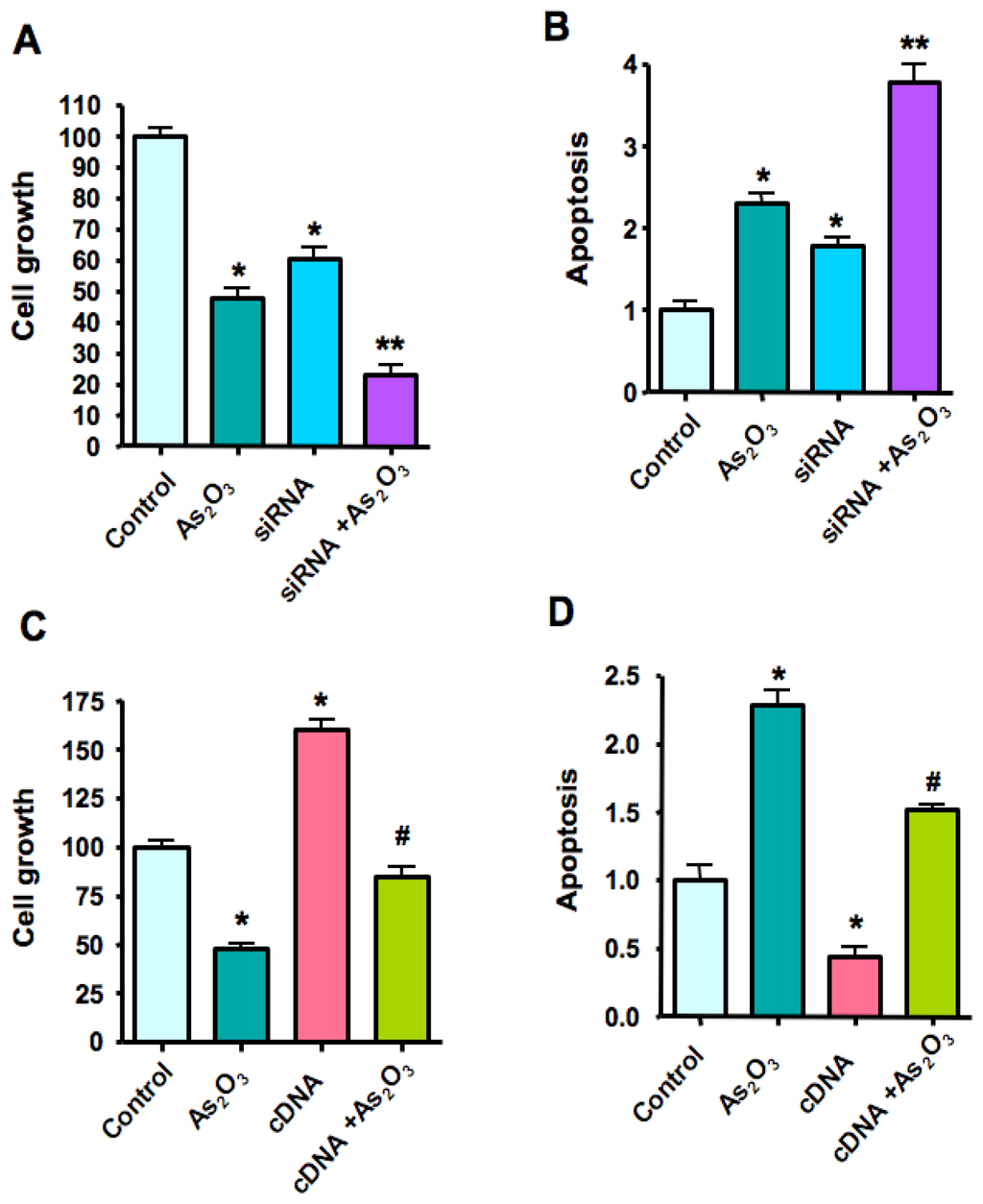 Notch-1 siRNA promoted, but Notch-1 cDNA reduced, As2O3-induced cell growth inhibition and apoptosis in SKBR-3 breast cancer cells (A–B). Left panel, down-regulation of Notch-1 by siRNA significantly inhibited SKBR-3 breast cancer cell growth. 8 μM As2O3 plus Notch-1 siRNA inhibited cell growth to a greater degree compared to As2O3 alone. Right panel, down-regulation of Notch-1 expression significantly increased apoptosis induced by As2O3. Notch-1 siRNA transfected cells were significantly more sensitive to spontaneous and As2O3-induced apoptosis (C–D). Over-expression of Notch-1 by cDNA transfection rescued As2O3-induced cell growth and abrogated As2O3-induced apoptosis to a certain degree. * p < 0.05, compared with the control; ** p < 0.05, compared with As2O3 treatment alone and Notch-1 siRNA transfection alone. # p <0.05, compared with As2O3 treatment alone and Notch-1 cDNA transfection alone.