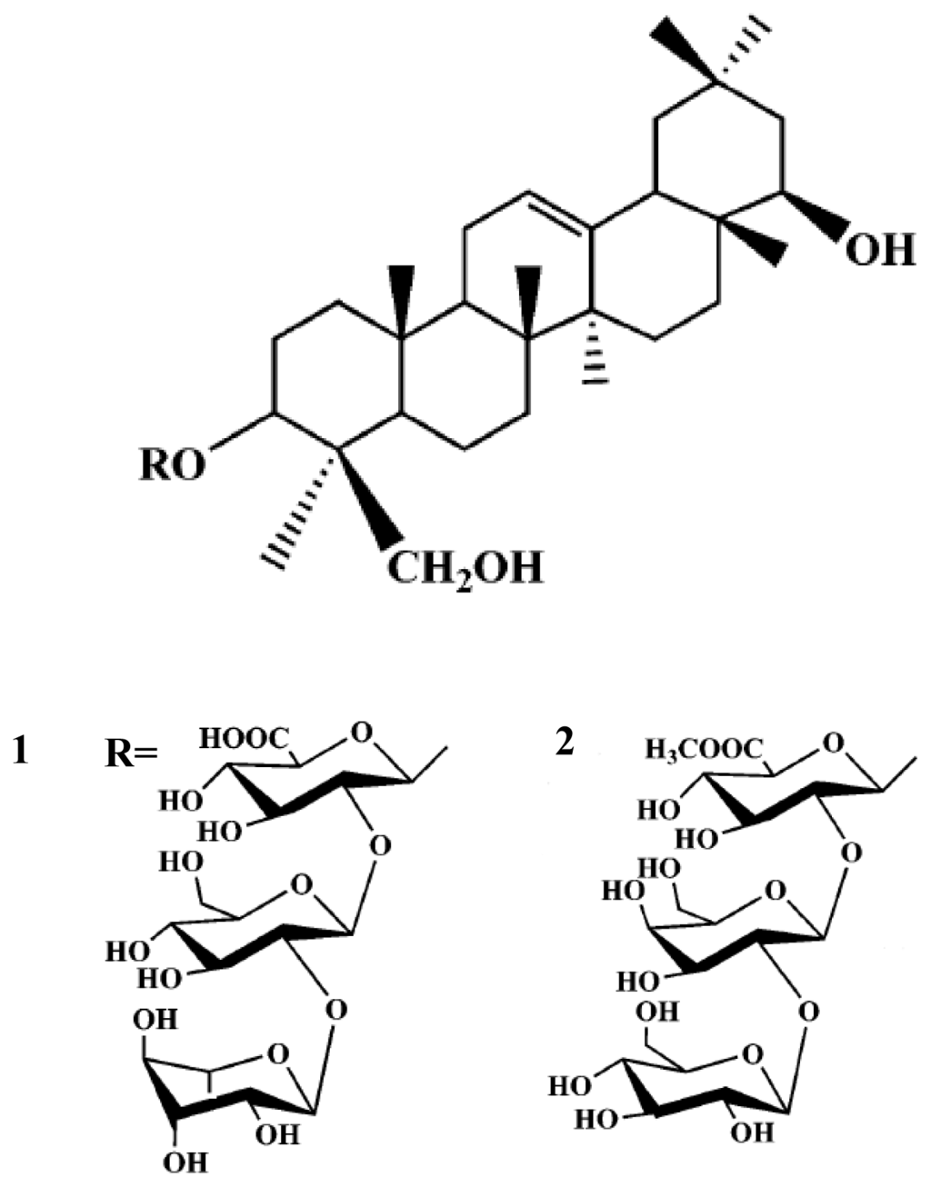 In the context of our natural drugs discovery program dealing with the development of new potential neuroprotection agents, we have examined the isolation of two compounds, 3-O-[α-l-rhamnopyranosyl(1–2)-β-d-glucopyranosyl(1–2)-β-d-glucuronopyranosyl]olean-12-en-3β,22β,24-triol (1) and 3-O-[β-d-glucopyranosyl(1–2)-β-d-galactopyranosyl(1–2)-β-d-glucuronopyranosyl]olean-12-en-3β,22β,24-triol (2) as leads for novel glutamate-induced toxicity inhibitors.