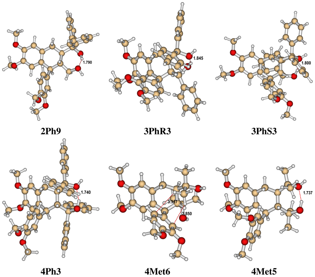 In this study the following chiral 1,4-diols (LIGNOLs) have been investigated: 1,1-diphenyl (2Ph), two diastereomers of 1,1,4-triphenyl (3PhR, 3PhS), 1,1,4,4-tetraphenyl (4Ph) and 1,1,4,4-tetramethyl (4Met) 1,4-diol. The minimum energy structure for each LIGNOL is shown in Figure 1 [2]. The code for the conformations is adopted from [2].