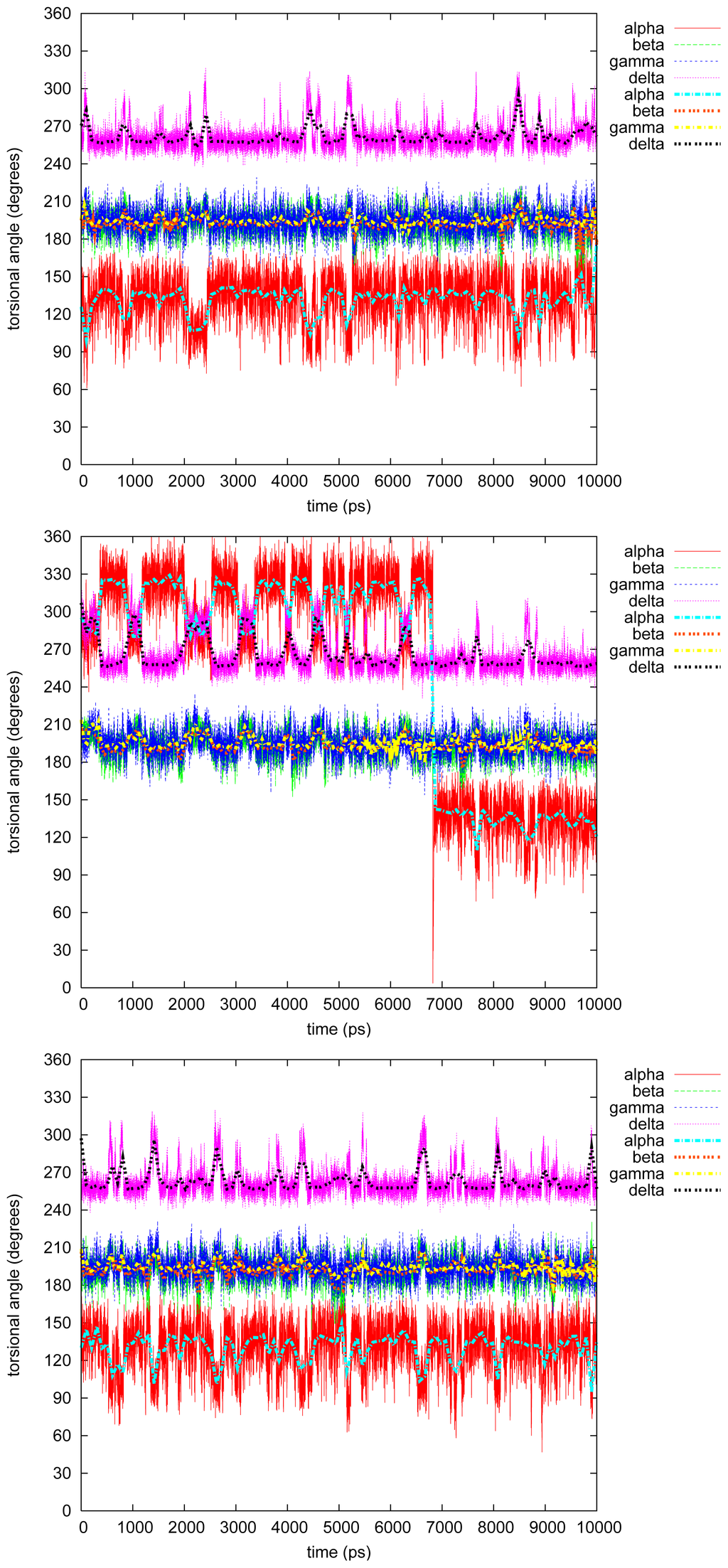 In the first two simulations β = 180° and γ = 195°, but in the third and last β is rather 165° and γ = 300°, even if the starting conformation here is α = 90°, β = 195° and δ = 300°. The torsional angle γ stays at 300° during the whole simulation.