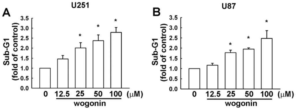 Cells were treated with various concentrations of wogonin for 24 h and then washed with PBS. For sub-G1 determination, cells were fixed with 70% ethanol at room temperature and then re-suspended in PBS containing 50 μg/mL propidium iodide (PI), 100 μg/mL RNase A and 0.1% Triton X-100 for 30 min. Cells were immediately analyzed using FACScan and the Cellquest program (Becton Dickinson, Lincoln Park, NJ, USA).