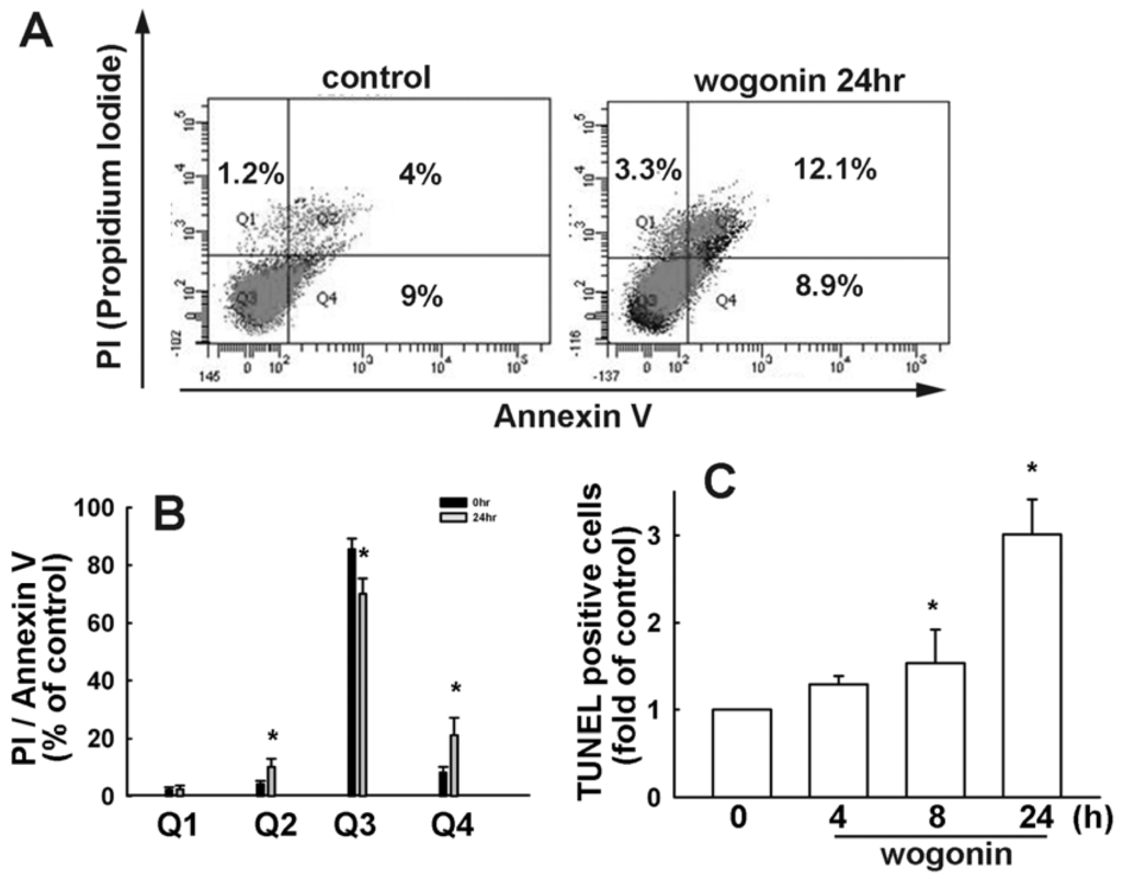 Wogonin induces cell apoptosis in U251 human glioma cells. (A and B) Cells were treated with wogonin (25 μM) for 24 h. The percentage of apoptotic cells was analyzed by flow cytometry of annexin V/PI double staining; (C) Cells were treated with wogonin (25 μM) for the indicated time periods, the TUNEL positive cells were examined by flow cytometry. Results are expressed as the means ± S.E.M. of at least three independent experiments. * p < 0.05 compared with the vehicle treatment group.