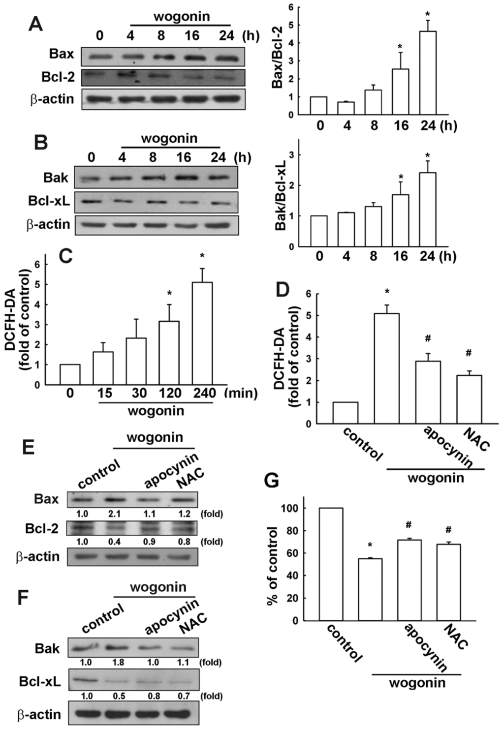Wogonin increases reactive oxygen species generation in U251 human glioma cells. (A and B) Cells were incubated with wogonin (25 μM) for the indicated time periods, the Bax, Bcl-2, Bak and Bcl-xL expression were examined by Western blot analysis. Results are representative of three independent experiments. The ratios of the quantitative data are shown in the right panels; (C) Cells were incubated with wogonin (25 μM) for the indicated time periods (15, 30, 60 or 120 min); (D) Cells were pretreated with apocynin (10 μM) or N-acetylcysteine (NAC) (10 mM) for 30 min followed by stimulation with wogonin for 120 min. Reactive oxygen species (ROS) generation was determined using the fluorescence probes H2DCFH-DA. The production of ROS was examined by flow cytometry. Results are expressed as the mean ± S.E.M. of three independent experiments. * p < 0.05 compared with the control group. Cells were pretreated with apocynin (10 μM) or NAC (10 mM) for 30 min followed by stimulation with wogonin for 24 h, the protein expressions were examined by Western blot analysis (E and F), and cell viability was determined by MTT assay (G). Results are expressed as the mean ± S.E.M. of three independent experiments. * p < 0.05 compared with the control group. # p < 0.05 compared with the wogonin treatment group.
