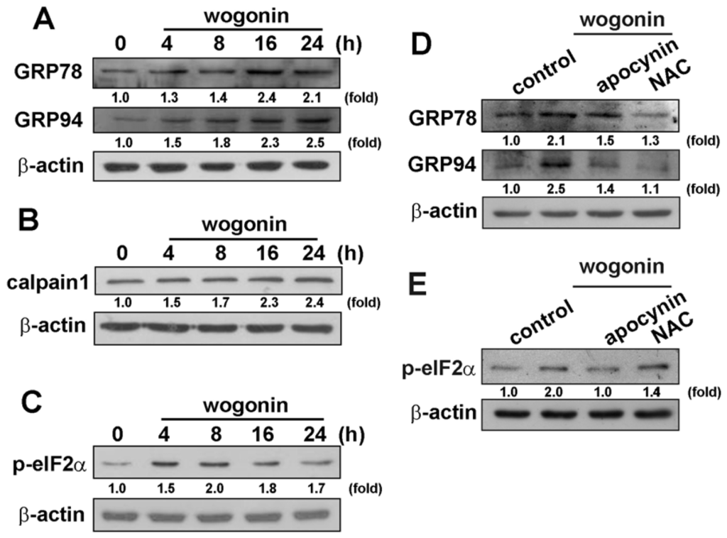 Wogonin increases endoplasmic reticulum (ER) stress-related protein activation in U251 human glioma cells. Cells were incubated with wogonin (25 μM) for the indicated time periods. GRP78 and GRP94 (A), calpain 1 (B) expression and eIF2α phosphorylation (C) were examined by Western blot analysis. Cells were pretreated with apocynin (10 μM) or NAC (10 mM) for 30 min followed by stimulation with wogonin for 24 h, GRP78 and GRP94 (D) expression, and eIF2α phosphorylation (E) were examined by Western blot analysis. Results are representative of three independent experiments.