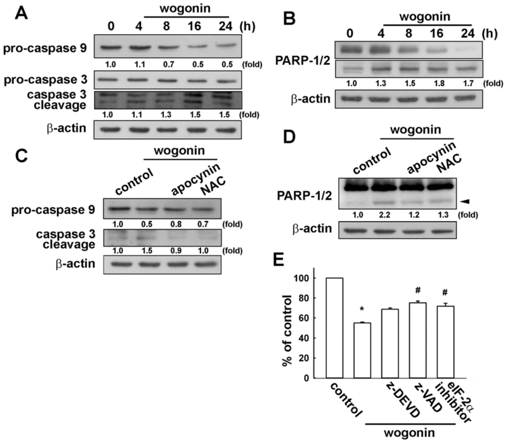 Wogonin induces activation of caspase-9, caspase-3 and PARP in U251 human glioma cells. Cells were incubated with wogonin (25 μM) for different time periods, levels of pro-caspase-9, pro-caspase-3 and cleaved caspase-2 (A) were examined by Western blot analysis. The expression of PARP cleaved form was also examined by Western blot analysis (B); (C and D) Cells were pre-incubated with apocynin and NAC for 30 min followed by treatment with wogonin for 24 h, the protein expressions were determined by Western blot analysis. Results are representative of at least three independent experiments; (E) Cells were pretreated with z-DEVD, z-VAD and eIF2 inhibitor for 30 min followed by stimulation with wogonin for 24 h, cell viability was determined by MTT assay.