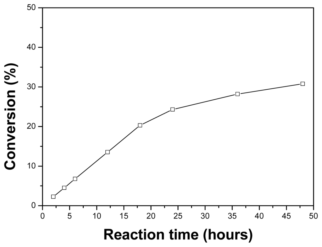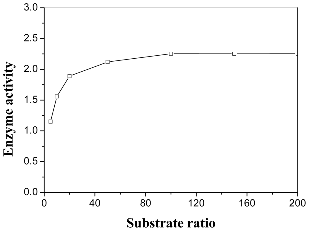 The rate of an enzymatic catalytic reaction also depends on the concentrations of the substrate []. In this study, the effect of the mole ratio of lactic acid to triptorelin from 1:1 to 200:1 on esterification was investigated when the amount of the enzyme and triptorelin were kept constant (Figure 1). It was found that the enzyme activity gradually increased with increasing substrate ratio. And a ratio of 100:1 turned out to be sufficient because the enzyme activity could not be improved after this point.