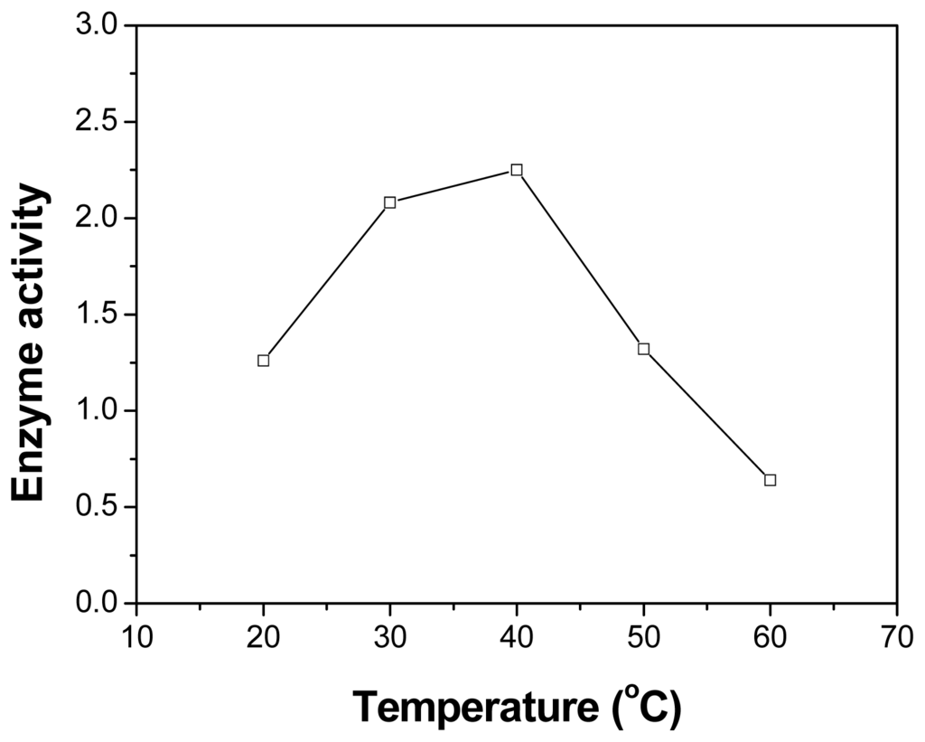 Various temperatures were selected to examine the temperature effect on the activity of PPL in the esterification of triptorelin. As shown in Figure 2, the enzyme activity increased obviously as the reaction temperature increased from 20 °C to 40 °C. The maximal enzyme activity was obtained at 40 °C, then it decreased marginally with further increasing temperatures.