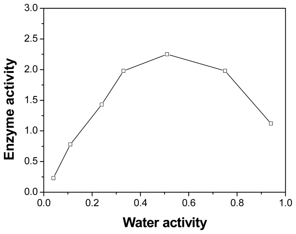 One of the most important factors, which may affect the enzyme behavior in nonaqueous media is the water activity []. In the present study, the esterification catalyzed by PPL was conducted at a wide range of initial aw values (0.04–0.95). As can be observed in Figure 3, the enzyme activity exhibits a bell-shaped curve with changing water activity, and PPL exhibits the highest activity when aw = 0.51. Further decrease or increase in the initial aw value resulted in an obvious decrease in enzyme activity.