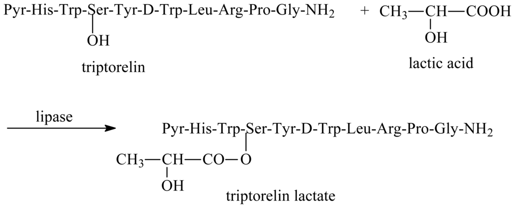 Triptorelin lactate was successfully synthesized by porcine pancreatic lipase (PPL) in organic solvents. The effects of acyl donor, substrate ratio, organic solvent, temperature, and water activity were investigated. Under the optimum conditions, a yield of 30% for its ester could be achieved in the reaction for about 48 h.