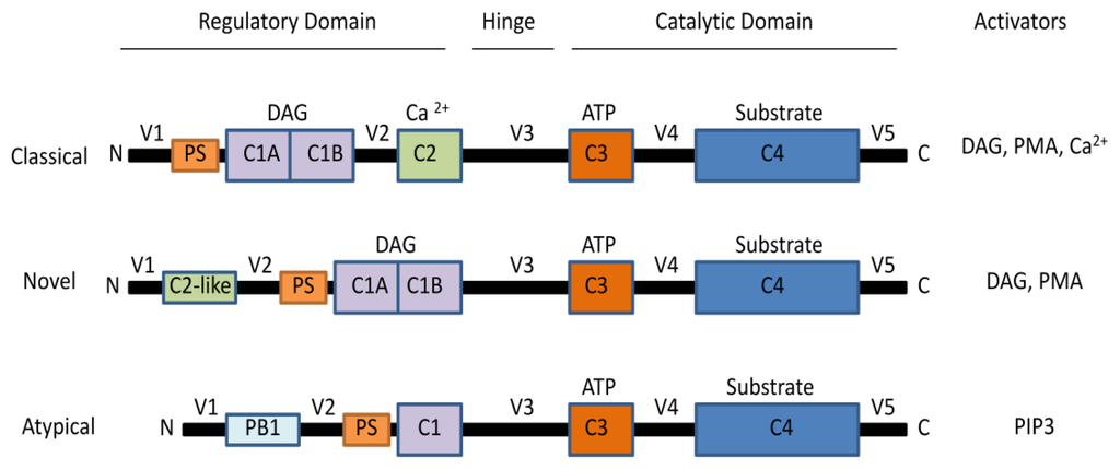 The PKC family is composed of serine/threonine protein kinases that are involved in a variety of pathways that regulate cell growth, differentiation, apoptosis, transformation and tumorigenicity. Most cells express more than one isoform, and each type of PKC mediates different cellular events [8,9]. The various PKC isoforms consist of NH2-terminal regulatory domains and COOH-terminal catalytic domains [10]. They also have in common the pseudosubstrate site (PS), which keeps the protein in its inactive form [11]. However, they differ in their structure, cofactor requirement and substrate specificity [11]. Thus, the 10 members of the PKC family have been divided into three major groups: the classical PKCs (cPKCs), including the α, βI, βII, and γ isoforms; the novel PKCs (nPKCs), including the θ, η, ɛ, δ isoforms; and the atypical PKCs (aPKCs), including the ζ and ι/λ isoforms [12–14]. The cPKC subfamily members possess conserved (C1–C4) and variable (V1–V5) regions, which are presented in Figure 1 [11,12]. They require calcium, phosphatidylserine and diacylglycerol (DAG) or phorbol esters for activation. The nPKCs differ from cPKCs in that they lack the C2 homologous domain and do not require calcium for activation. Finally, aPKCs lack both the C2 and half of the C1 homologous domains, thus rendering them insensitive to DAG, phorbol esters, and calcium [10,15]. Figure 1 depicts the three classes of PKCs and their respective activators. PKCμ and PKCυ isorforms are now classified as members of the DAG receptor protein kinase D (PKD), which is a family of serine/threonine protein kinases classified as a subfamily of the Ca2+/calmodulin-dependent kinase (CaMK) superfamily. For a complete review of PKD see [16,17].