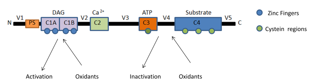 Schematic representation of susceptible sites to oxidation of PKCs.