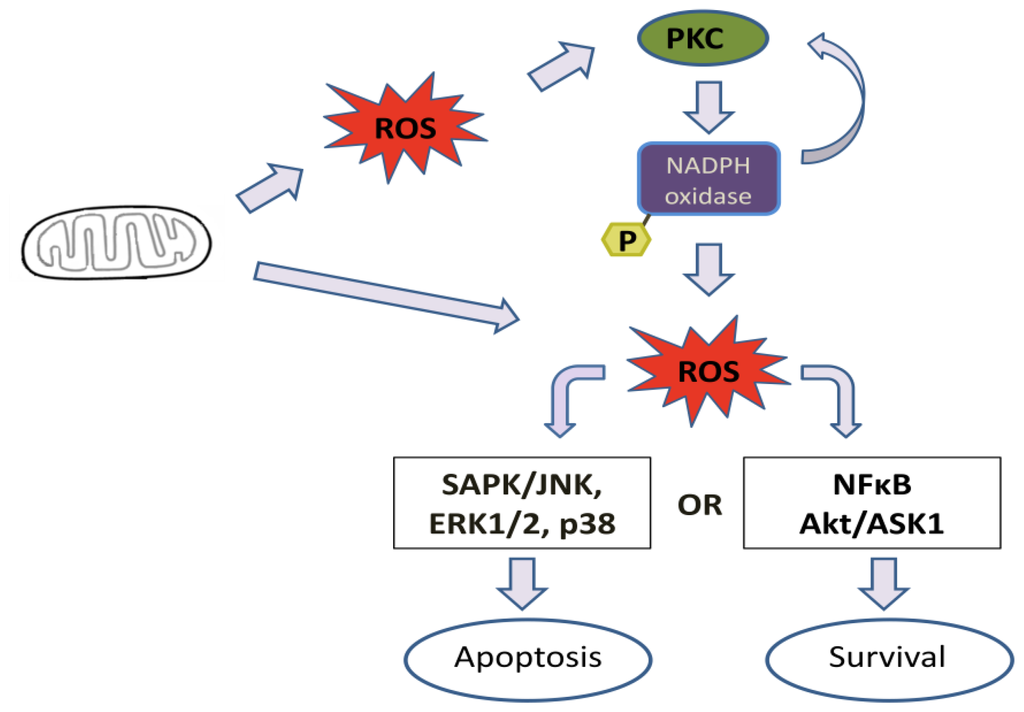 Because different PKC isoforms are present in a variety of cells and are involved in a number of signaling pathways, it is difficult to ascribe a common ROS-dependent mechanism for all PKC isotypes. However, it seems that under pathological conditions, a general signaling mechanism is triggered in mitochondrial dysfunction. In this context, an increase in ROS production by mitochondria activates local PKCs, which in turn activate Nox enzymes. Nox enzymes could also activate another group or the same group of PKCs in a feedback mechanism. Consequently, the redox state of the cell becomes imbalanced. Depending on the stimuli, proapoptotic signaling may occur through ROS activation of MAPK, such as SAPK/JNK, ERK1/2 and p38, or antiapoptotic signals ccould be triggered through activation of the NFκB or Akt/ASK1 pathway [177]. Figure 3 represents a general mechanism of cell signaling activation trough mitochondria/PKC/NADPH oxidase. This mechanism can be different depending on the cell and activation stimulus. More studies are necessary to elucidate the mechanisms that are involved in these signaling pathways.