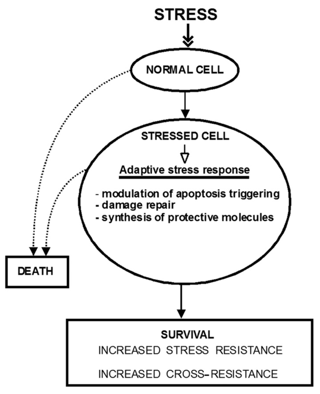 Adaptive stress response. Stress responses are mechanisms to adapt to and to overcome stress stimuli. Through them, the cells can restore stress-damaged structures or trigger cell death. Stress responses to mild/moderate stress may result in enhanced defense and repair and even cross-resistance to multiple stressors. This state is called adaptive stress response and it is achieved through multiple mechanisms, including modulation of apoptosis triggering [], damage repair [] and synthesis of protective molecules []. The solid line arrows point to the positive outcome, the dotted-line arrows to the negative one.