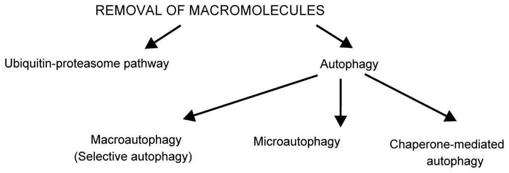 Pathways to remove stress-damaged macromolecules. The two major degradation pathways in eukaryotes are the ubiquitin-proteasome pathway (UPP) and autophagy. UPP is the degradation pathway for soluble proteins. In response to oxidative stress, it degrades oxidized proteins []. Through degradation of the transcription factor nuclear factor-E2-related factor 2 (Nrf2) that is involved in the transcriptional regulation of antioxidant enzymes, the UPP participates in the regulation of the intracellular redox status [,]. Autophagy is the name for several degradation pathways. Its best-described form is macroautophagy, the non-selective process of engulfment of cellular material into double membrane vesicles, which are delivered to lysosomes for degradation [,]. It has been recently appreciated that autophagy is also selective, called selective autophagy, in which the cargo is recognized by adaptor proteins []. Tiny portions of cytoplasm are sequestered and subsequently engulfed by lysosomes in microautophagy [,]. This process is well known in yeasts, however, there are not enough data on the mechanisms and physiological relevance of the mammalian microautophagy so far []. Chaperone-mediated autophagy (CMA), described only in mammals, delivers selected proteins into lysosomes through specific receptors [].