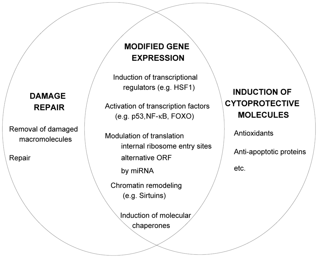 Cell repair and protection. Modulation of protein activity and expression has a key role in cell repair and protection during the adaptative stress response. The stress-modified regulation of transcription occurs, for example (1) by the induction of heat shock factors (HSF), which are the transcriptional regulators of genes encoding molecular chaperones and other stress proteins []; (2) by chromatin remodeling promoted by histone and DNA methyltransferases, demethylases, histone acetlytransferases and deacetylases []. The activity of histone deacetylases, like mammalian Sirtuin 1, is increased during nutrition stress [,]; (3) by the induction of various transcription factors [–]. The processes described above are interconnected at many levels; for example histone deacetylases sirtuins are involved in the regulation of transcription factors p53 and FOXO [–,]. p53 has also non-transcripitonal activities; e.g., it interacts with apoptosis regulators []. The regulation of protein translation and activation is also crucial for stress-adaptation. The increased availability of a protein during the stress response can be achieved by reduced degradation (e.g., of p53), modifications in protein expression by translational regulation from the internal ribosome entry sites, upstream open reading frames, and modulation by micro RNA (miRNA) []. p53 and NF-κB regulate the transcription and processing of miRNA. The processes described are interconnected further; for example the different members of the heat shock protein family have a role in all of the described processes: in the activation of HSF, their transcription is stimulated during stress, they participate in repair processes and as anti-apoptotic proteins in combination with apoptosis regulators from the BCL2 family [].