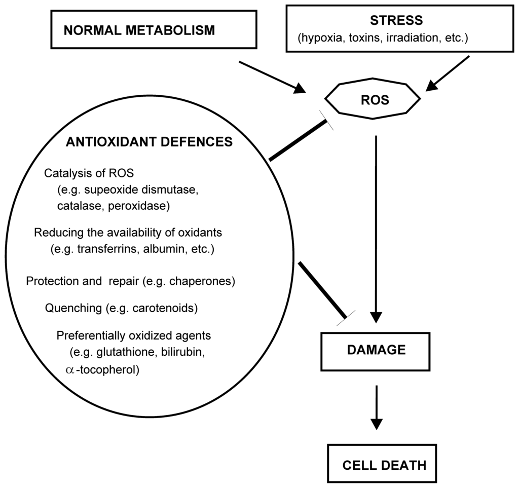 Antioxidant defenses. Antioxidant defenses can prevent the generation of reactive oxygen species (ROS) and intercept free radicals []. There are enzymatic defenses and non-enzymatic defense systems that protect the cells against free radicals and ROS []. The formation of some ROS is inevitable during normal metabolism and is necessary also for normal cell function.