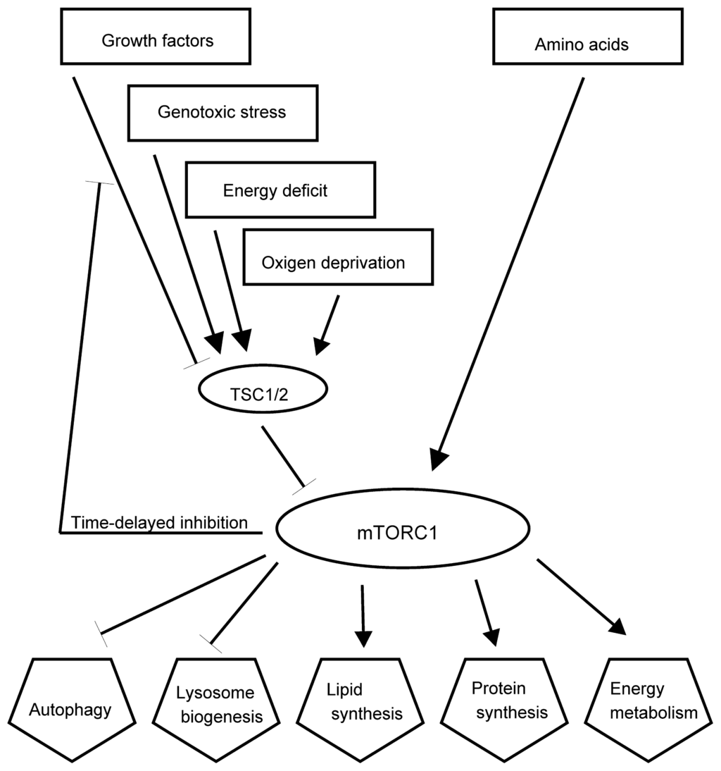 Stress, like hypoxia, energy deprivation, DNA damage and inflammation, activates TSC1/2, thus inhibiting mTORC1 activity. Amino-acid activation of mTORC1 is regulated by Rag GTPase and is independent of TSC1/2 []. A possible mechanism of mTOR regulation could involve the targeting of mTORC1 to different locations within the cells. The availability of amino acids stimulates the translocation of mTORC1 to the lysosomal surface, where it associates with Rheb resulting in activation of mTOR kinase [,]. In cells exposed to moderate starvation lysosomes relocate from close to the plasma membrane to the perinuclear microtubule organizing center []. During starvation, mTOR co-localizes with protein LC3 after the formation of autophagosomes []. This step may be sensitive to ROS, as the oxidation of mTOR results in the inhibition of its activity []. The association of mTORC1 with autophagosomes may facilitate autophagosome-lysosome fusion. The changes in lysosomal positioning in response to nutrients are mediated by intracellular pH, which is increased during starvation [].