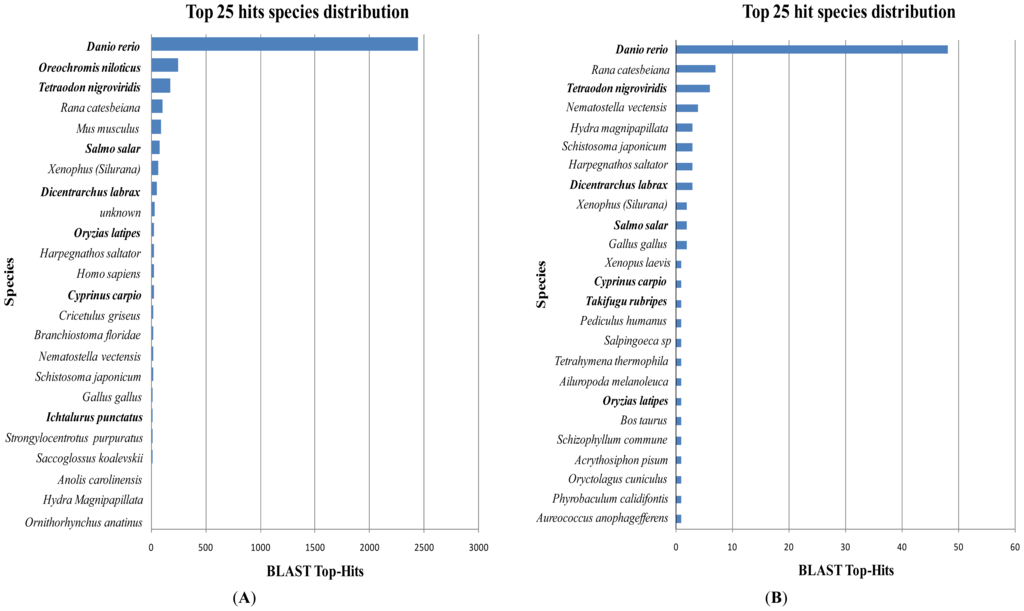 Top 25 hit species distribution based on BLASTx. E value cut-off is 10−5. Singleton (A) and contig (B). Bold text indicates teleosts.