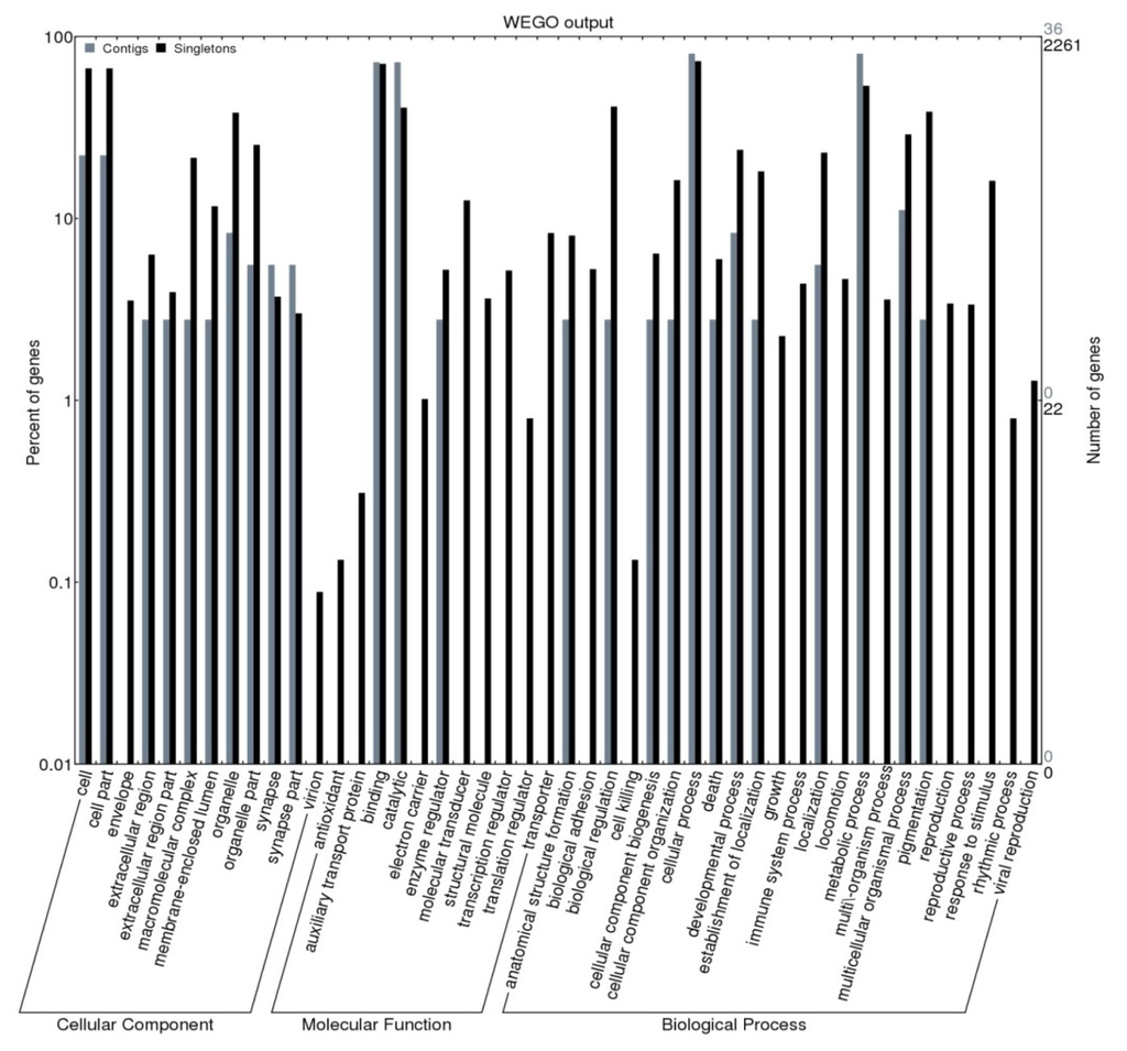 Gene Ontology (GO) terms could be assigned to 47,250 H. siamensis contigs (857) and singletons (46,393) based on BLAST matches to proteins with known functions (Figure 3, Table S1). GSS coding sequences were assigned to cellular components (4004 sequences), molecular function (4790 sequences) and biological processes (8313 sequences) (Figure 3). Among the H. siamensis GSSs assigned molecular functions, many were assigned to binding or catalytic functions, predominantly either enzyme regulators or molecular transducers (Figure 3). Cellular component assignments showed many GSS coding sequences were likely to possess cell and cell part functions, while those assigned biological process were mostly predicted to be involved in cellular or metabolic processes. Analyses of sequences in other fish species have identified transcripts possessing a similar range of potential metabolic functions [20,30,31].