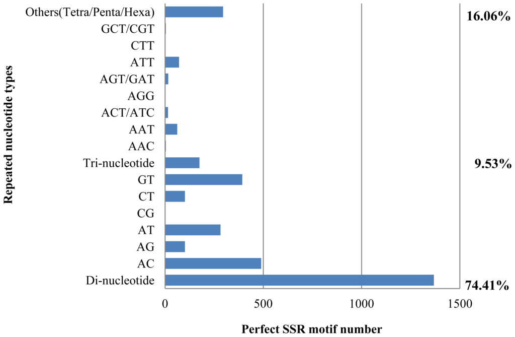 Distribution of simple sequence repeat (SSR) nucleotide classes among different nucleotide types in H. siamensis.