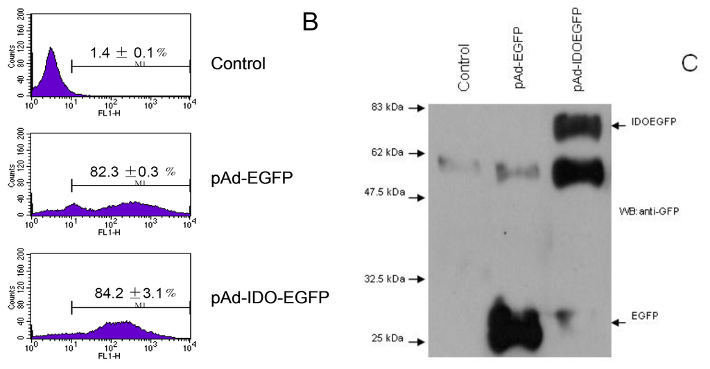 MT-2 cells were susceptible to the adenoviral infection. GFP expression could be visualized by fluorescent microscopy within 12 h of the addition of recombinant adenovirus (data not shown). The efficiency of infection was determined by fluorescent microscopy and flow cytometry (Figure 1A,B). As illustrated in Figure 1, more than 80% of MT-2 cells were infected by pAd-EGFP or pAd-IDOEGFP after 60 h of infection. To determine the IDOEGFP protein expression, MT-2 cells were infected with pAd-IDOEGFP at MOI of 100 for 60 h, then harvested and lysed with RIPA buffer and checked for IDOEGFP expression by Western blot using anti-GFP monoclonal antibody. As expected, EGFP (26-kDa) and IDOEGFP (68-kDa) protein bands were observed in cells infected with pAd-EGFP and pAd-IDOEGFP respectively, but not in non-infected cells (Figure 1C). To further confirm the expression of IDOEGFP fusion protein, the MT-2 cells infected with pAd-IDOEGFP were lysed and analyzed by Western blot with IDO polyclonal antibody and the results showed that a IDOEGFP protein band with a 68-kDa molecular weight was observed in these infected cells, but not in pAd-EGFP infected cells or non-infected cells (data not shown).