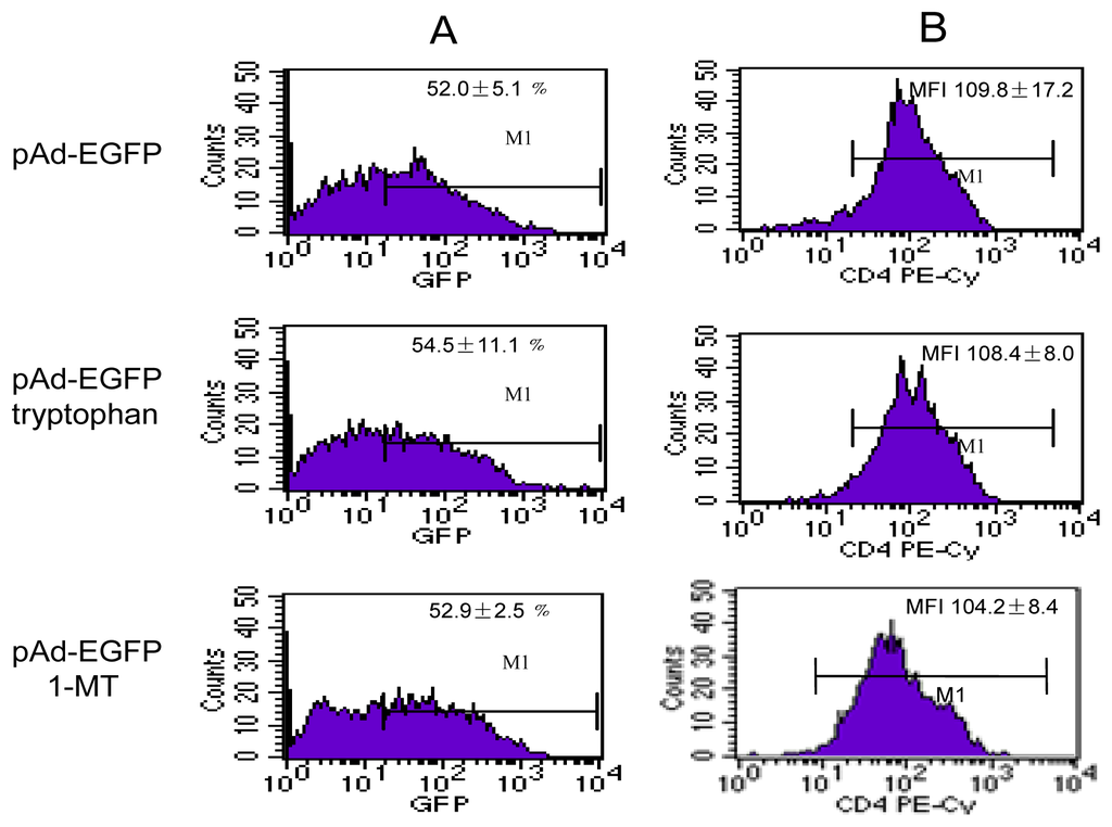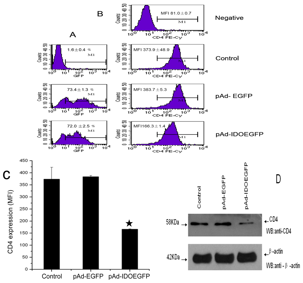 There is no evidence that human T cells can express IDO, however, the immuno-modulatory effects of IDO on T cells are related to the pericellular degradation of tryptophan []. Several cell types, including Ds and macrophages, may express IDO, which can be increased in response to IFN-γ and the expression of IDO in DCs can downregulate type 1 diabetes, in which CD4+ T cells are involved. Plasmacytoid dendritic cells (pDCs) express IDO and can downmodulate immune reactions through IDO-mediated tryptophan depletion []. At first, we were unable to infect PBMC with EGFP-marked adenovirus (data not shown), so we gave up using IDO-expressing DCs co-cultured with CD4+ T cells, which, after culture, could be analyzed for CD4 expression. Following this, two kinds of cell lines (MT-2 and C8166 lines) were used for the study, because the infection rate was high and (52%–74%) and the experiments were not complicated: instead of the co-culture system, the downregulation of CD4 could be checked in cultured T cell lines.