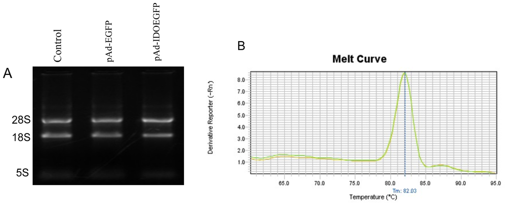The expression of human CD4 mRNA in IDO expressing C8166 cells. C8166 cells were infected with either pAd-EGFP or pAd-IDOEGFP, and at 60 h post transfection, the total RNA was extracted and the cDNA was synthesized as described in the Materials and Methods section. Panel A illustrate the total RNA from untreated (control), pAd-EGFP or pAd-IDOEGFP infected C8166 cells, extracted as described in methods and subjected to electrophoresis through a native 1.5% agarose gel; Panel B displays melting curves of RT-PCR product generated using GeneAmp Ster One Plus SDS software.