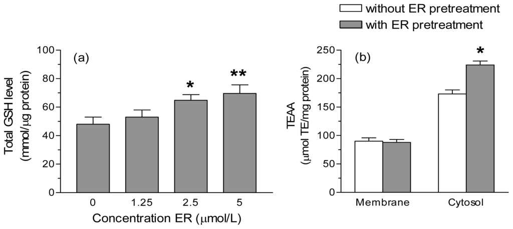 Preliminary experiments showed that the treatment of SH-SY5Y cells with ER concentrations up to 5 μmol/L for 24 h did not affect intracellular redox state, MMP, cell growth and viability (data not shown). We first determined the ability of ER (1.25–5 μmol/L) to increase the total GSH levels in SH-SY5Y cells. Treatment of SH-SY5Y cells with 2.5 and 5 μmol/L of ER for 24 h resulted in significant increases (~35% and ~45%, respectively) in cellular GSH content (Figure 1a). We then evaluated whether the higher levels of GSH induced by ER effectively improves the TAC of SH-SY5Y cells at different subcellular levels, such as the membrane and cytosol. TAC was measured for its ability to quench the 2,2′-azinobis-(3-ethylbenzothiazoline-6-sulfonic acid (ABTS) radical cation (ABTS•+) and the results are expressed as trolox equivalent (TE) μmol/mg protein. The cytosolic, but not the membrane, fractions obtained from SH-SY5Y cells treated with 5 μmol/L of ER for 24 h showed significant increases of TAC compared to untreated cells (Figure 1b).