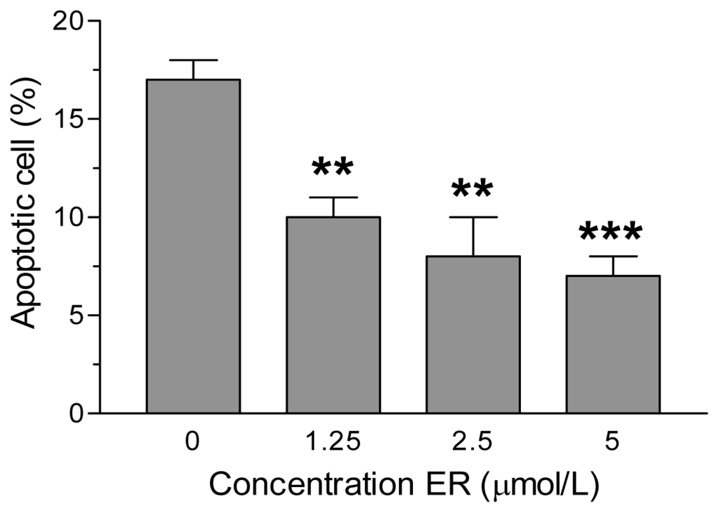 ER prevents 6-OHDA-induced apoptosis in SH-SY5Y cells. SH-SY5Y cells were incubated with various concentrations of ER for 24 h and then treated with 6-OHDA (200 μmol/L) for 2 h at 37 °C. After a further 15 h of incubation in medium without 6-OHDA, the apoptotic cells were determined by Annexin V staining and fluorescence microscopy as described in the Experimental Section. The values are expressed as a percentage of total number of apoptotic cells and shown as mean ± SEM of three/four independent experiments. ** p < 0.01, *** p < 0.001 versus untreated cells at ANOVA with Dunnett post hoc test.