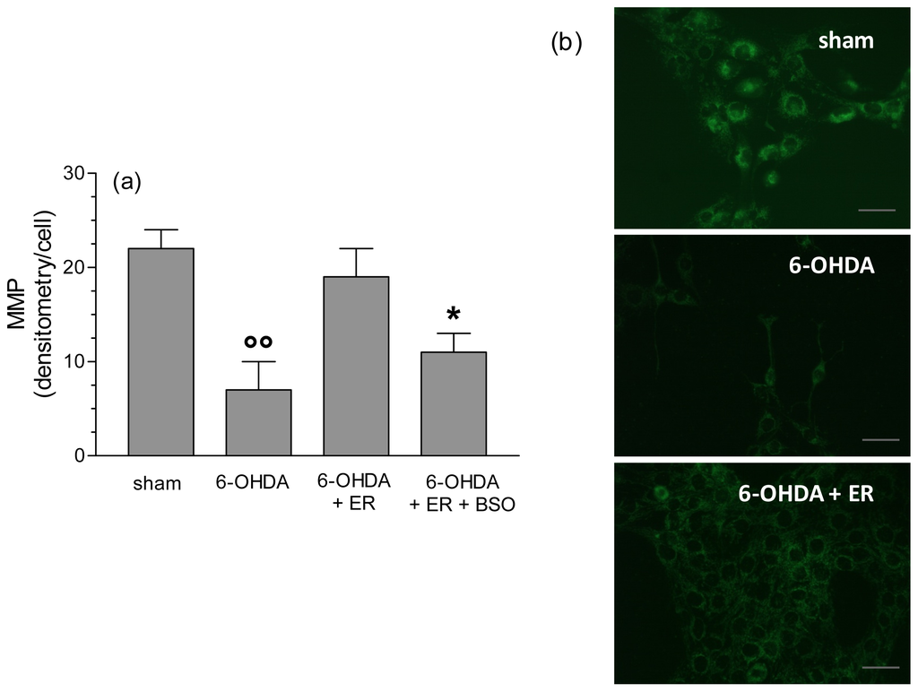 ER prevents the loss of mitochondrial membrane potential (MMP) induced by 6-OHDA in SH-SY5Y cells. (a) SH-SY5Y cells were incubated with ER (5 μmol/L) in absence or presence of buthionine sulfoximine (BSO) (400 μmol/L) for 24 h and then treated with 6-OHDA (200 μmol/L) for 2 h. At the end of incubation, MMP was determined using a fluorescence probe, rhodamine 123 (Rh-123), as described in the Experimental Section. Four randomly selected areas with 50–100 cells in each were analyzed under a fluorescence microscope and the values obtained are expressed as densitometry/cell. Values are shown as mean ± SEM of four independent experiments: ∘∘ p < 0.01 versus untreated cells, * p < 0.05 versus cells treated with 6-OHDA + ER at ANOVA with Bonferroni post hoc test; (b) representative images of MMP. Scale bars: 100 μm.