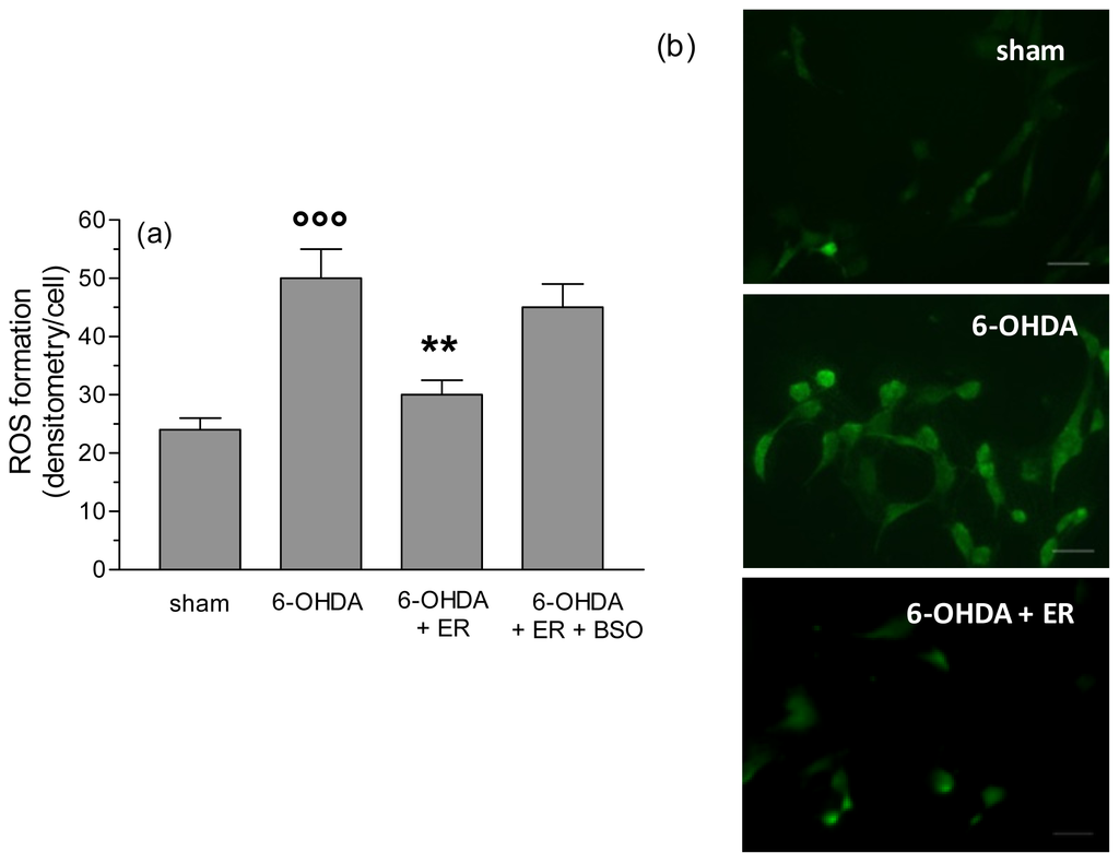 ER counteracts 6-OHDA-induced intracellular ROS formation in SH-SY5Y cells. (a) SH-SY5Y cells were incubated with ER (5 μmol/L) in absence or presence of BSO (400 μmol/L) for 24 h and then treated with 6-OHDA (200 μmol/L) for 2 h. At the end of incubation, ROS formation was determined using a fluorescence probe, DCFH-DA, as described in the Experimental Section. Four randomly selected areas with 50–100 cells in each were analyzed under a fluorescence microscope and the values obtained are expressed as densitometry/cell. Values are shown as mean ± SEM of four independent experiments: ∘∘∘ p < 0.001 versus untreated cells, ** p < 0.01 versus cells treated with 6-OHDA at ANOVA with Bonferroni post hoc test; (b) representative images of ROS formation. Scale bars: 100 μm.