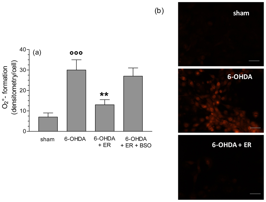 ER counteracts 6-OHDA-induced intracellular O2•− formation in SH-SY5Y cells. (a) SH-SY5Y cells were incubated with ER (5 μmol/L) in absence or presence of BSO (400 μmol/L) for 24 h and then treated with 6-OHDA (200 μmol/L) for 2 h. At the end of incubation, O2−− formation was determined using a fluorescence probe, DHE, as described in the Experimental Section. Four randomly selected areas with 50–100 cells in each were analyzed under a fluorescence microscope and the values obtained are expressed as densitometry/cell. Values are shown as mean ± SEM of four independent experiments: ∘∘∘ p < 0.001 versus untreated cells, ** p < 0.01 versus cells treated with 6-OHDA at ANOVA with Bonferroni post hoc test; (b) representative images of O2•− formation. Scale bars: 100 μm.