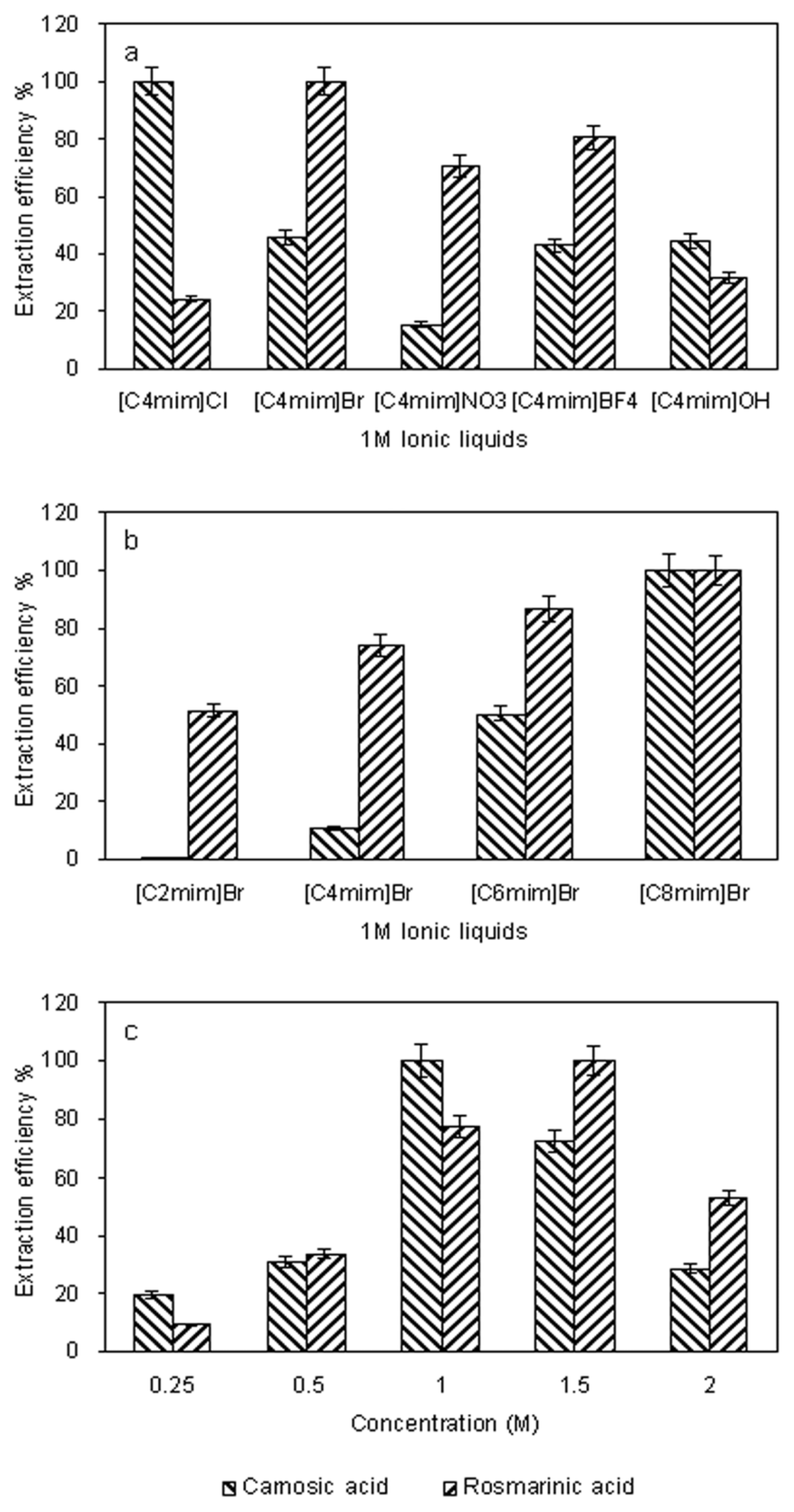 The results obtained are given in Figure 1a. The ionic liquids based on Cl− and Br − were the most efficient of the liquids tested for carnosic acid; BF4 − and Br− were the most efficient for rosmarinic acid, with Br− showing the best results. This result indicates that extraction efficiency of phenolcarboxylic acids is anion-dependent, which is consistent with a previous study [25].