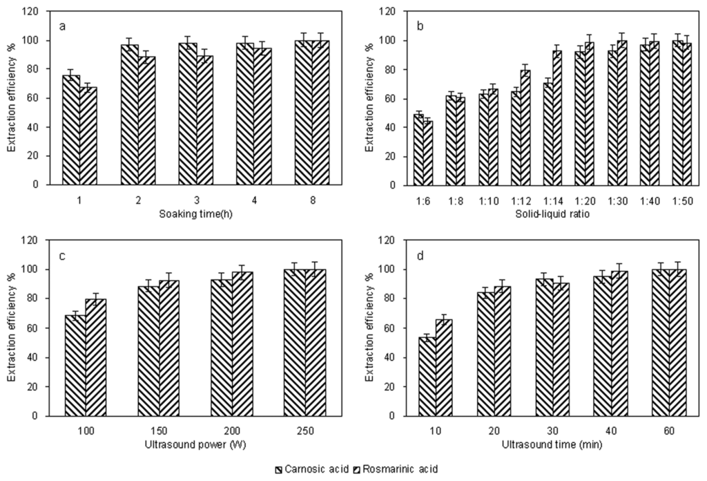 The recoveries of carnosic acid and rosmarinic acid were taken as the indicative markers for the stability of carnosic acid and rosmarinic acid at the derived operating extraction conditions.