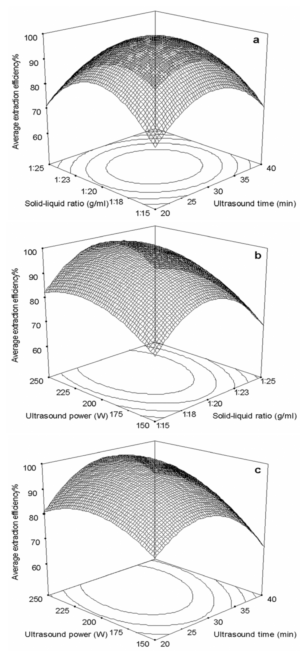The response surfaces for the effect of independent variables on average extraction efficiency of carnosic acid and rosmarinic acid were showed in Figure 3. Figure 3a–c presented the interaction of ultrasound time and solid–liquid ratio, ultrasound power and solid–liquid ratio, ultrasound power and ultrasound time, respectively.