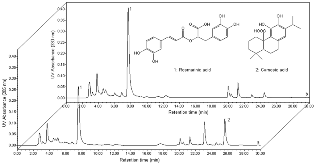 The mobile phase used was composed of acetonitrile (A) and 2% formic acid aqueous solution (B) using the following gradient elution program for separation: 0–10 min, 30% (A); 10–15 min, 30%–80% (A); 15–25 min, 80% (A); 25–30 min, 80%–30% (A). The flow rate used for chromatography was 1 mL/min, and the injection volume was 10 μL. The UV detection wavelengths were 285 nm for carnosic acid and 330 nm for rosmarinic acid, the column temperature was ambient and the running time was 30 min. For standard sample solution, various amounts of carnosic acid and rosmarinic acid were dissolved in methanol to yield the stock solutions at concentration of 20 and 2 mg/mL, respectively. The retention times of carnosic acid and rosmarinic acid were 25.8 and 7.7 min, respectively. Under these conditions, the two phenolcarboxylic acids were resolved sufficiently to give baseline separation. Carnosic acid and rosmarinic acid were identified by comparing their retention times with standard solutions.