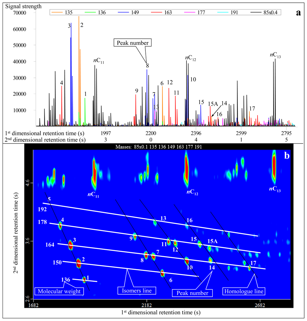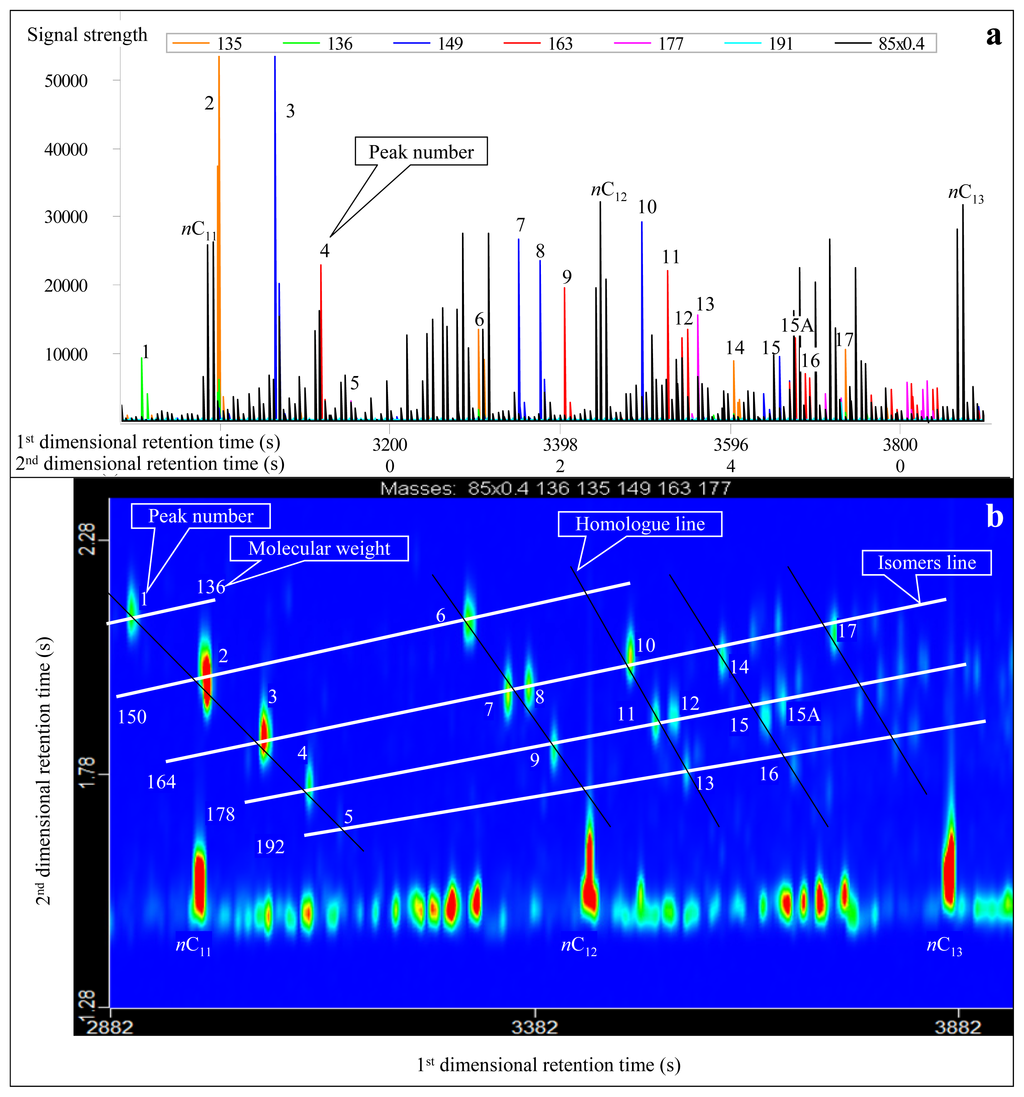 - Wang, H.T.; Weng, N.; Zhang, S.C.; Chen, J.P.; Wei, C.Y. Characteristics and identification of saturated hydrocarbons by comprehensive two-dimensional gas chromatography coupled to time-of-flight mass spectrometry (in Chinese with English abstract). J. Chin. Mass Spectrom. Soc 2010, 31, 18–27. [Google Scholar]