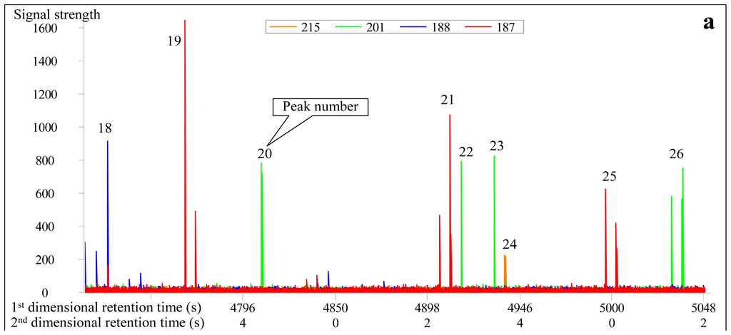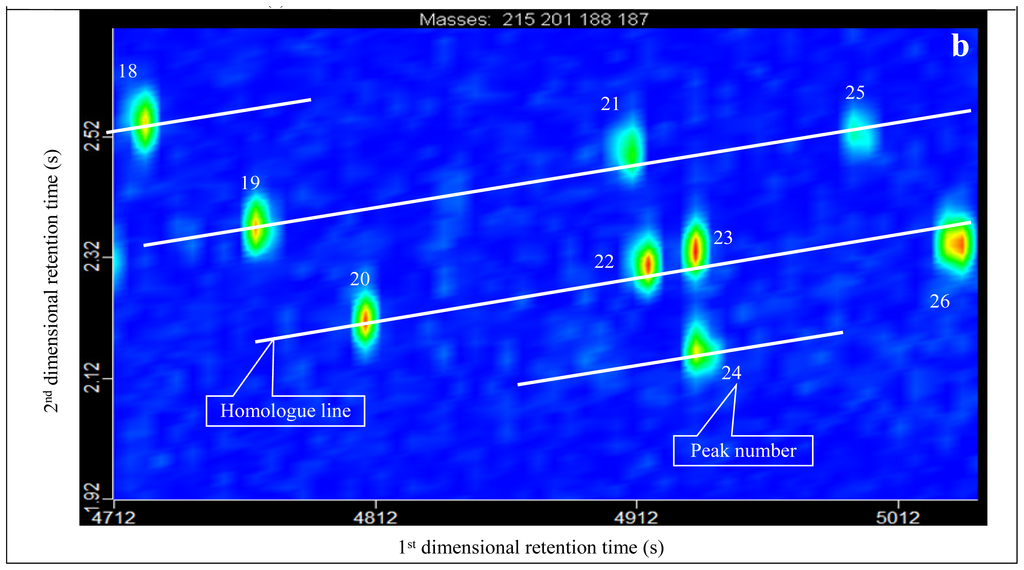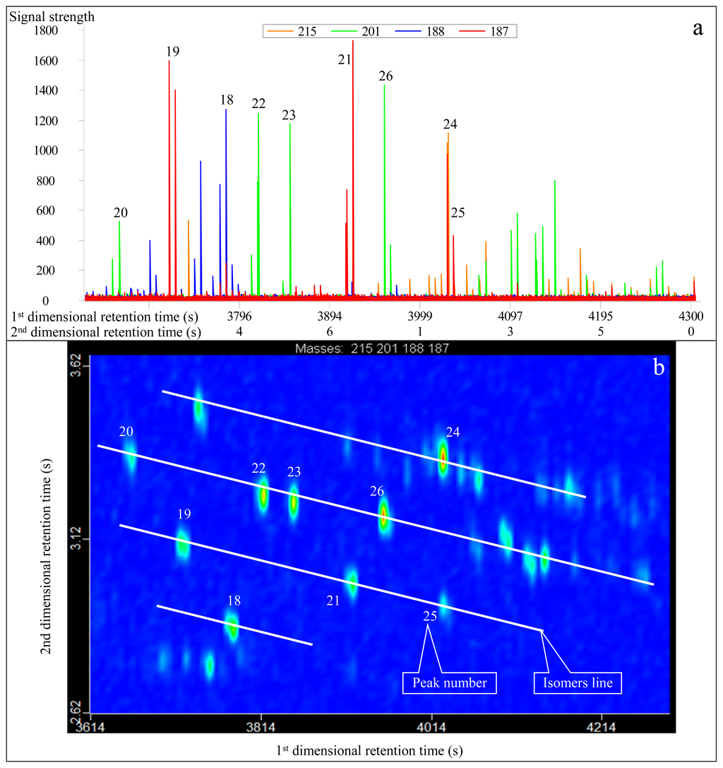 Nine diamantane homologues were identified, ranging from C15 to C17 (No. 18 to 26 peaks in Figure 3a and Table 1), of which the No. 22 compound is the overlapped peak of 1,2-dimethyl-diamantane and 2,4-dimethyl diamantane. The No. 22, 23 and 24 peaks commonly coelute in conventional GC-MS analysis []. In contrast, in GC×GC-TOFMS analysis, the No. 23 and 24 peaks have the same first-dimensional retention time of 4934 s (Table 1). However, their second-dimension retention times are 2.164 s and 2.330 s, respectively, showing a difference of 0.166 s (Table 1). Thus, they can be preliminarily separated based on masses by first-dimensional analysis, and can be effectively separated by second-dimensional analysis (Table 1, Figure 3).
