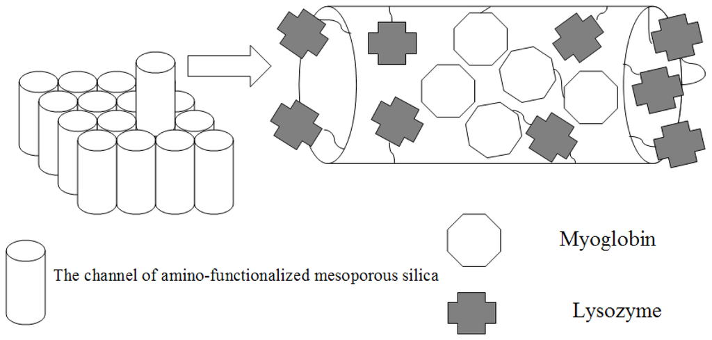 In order to overcome the leakage problem, two-step immobilization was carried out to achieve the immobilization of the enzyme in this experiment. Herein, myoglobin and lysozyme were selected as a model protein owing to its well known physicochemical property and commercial availability. First, amino-functionalized mesoporous molecular sieve was used to absorb myoglobin. Second, lysozyme was linked to the amino group of the amino-functionalized mesoporous molecular sieve to avoid the leaching of the absorbed myoglobin. Finally, the bifunctional bioreactor was obtained (Figure 1).