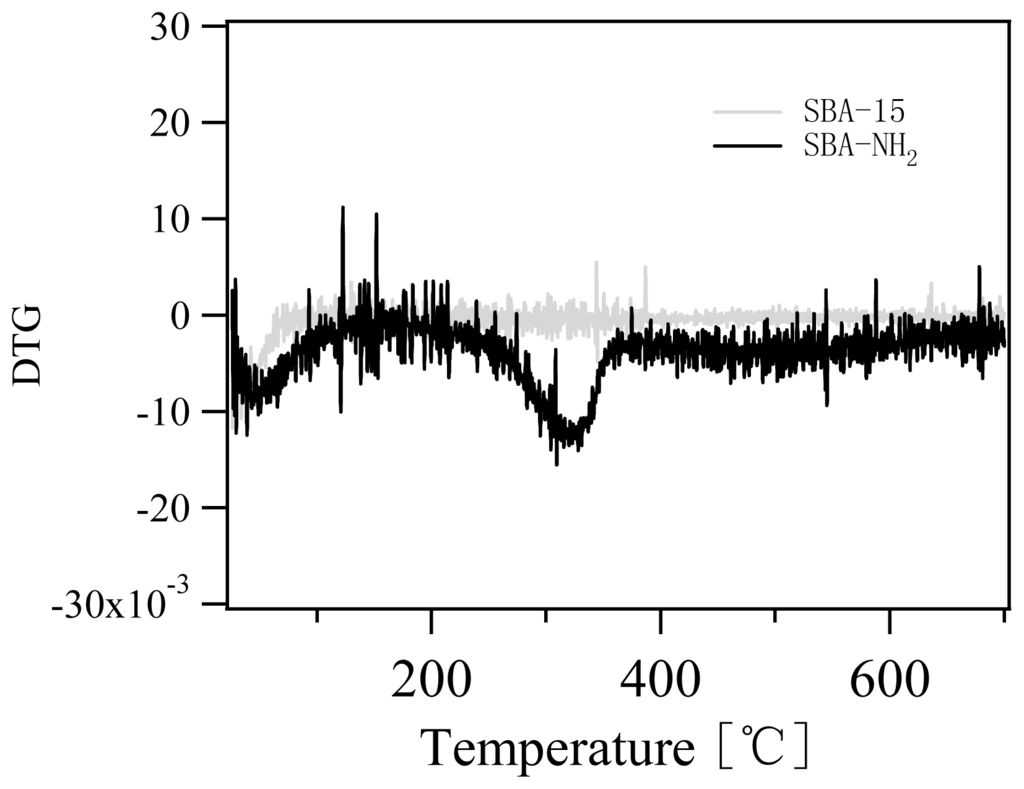 The DTG profile of amino-functionalized mesoporous silica showed two peaks at 50 °C and 320 °C, respectively (Figure 3). The evaporation of physically adsorbed water gave rise to the weight loss at temperature lower than 100 °C. The decomposition of aminopropyl group of amino-functionalized mesoporous silica resulted in weight loss at 250 °C–500 °C [13]. Moreover, either the dehydroxylation of the Si-OH group or the elimination of the residual ethoxy group originated from incomplete hydrolysis of silicon ethoxide might lead to the slight weight loss above 500 °C [21–22].